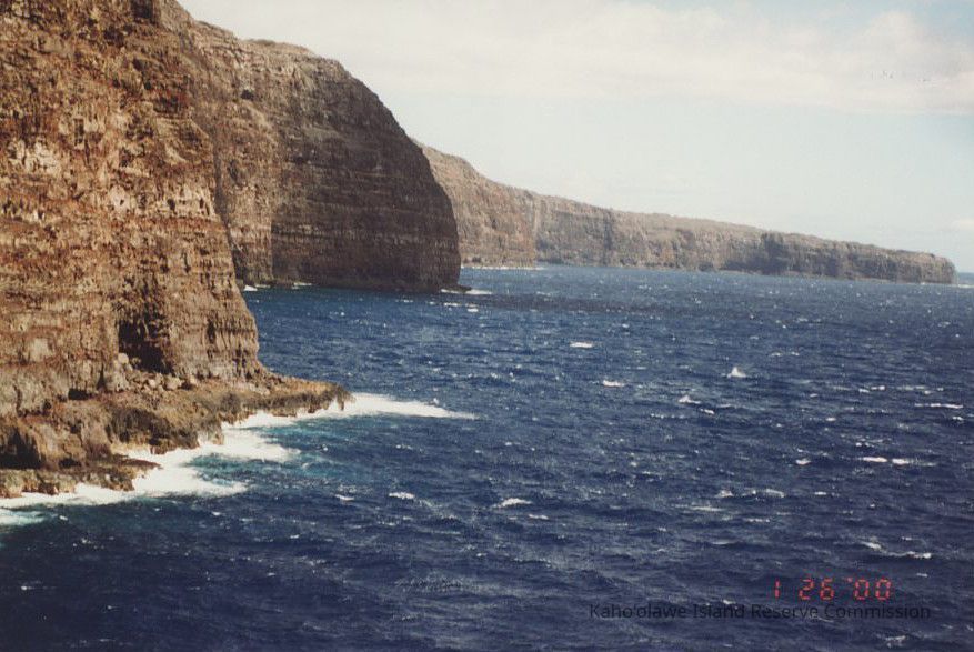 The image captures a rugged coastal cliff facing turbulent blue ocean waters under a slightly cloudy sky.