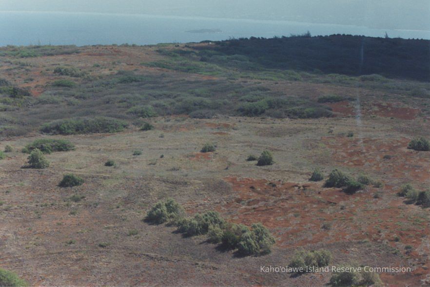 An aerial photo of Luamakika from the southern slope (of Puu O Moaula Nui?), with irowood trees, Molokini and Maui in the background.Collection
