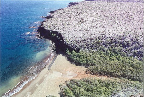 Color aerial photo of an unidentified beach and dry waterbed. Coral beds are in the background.Collection