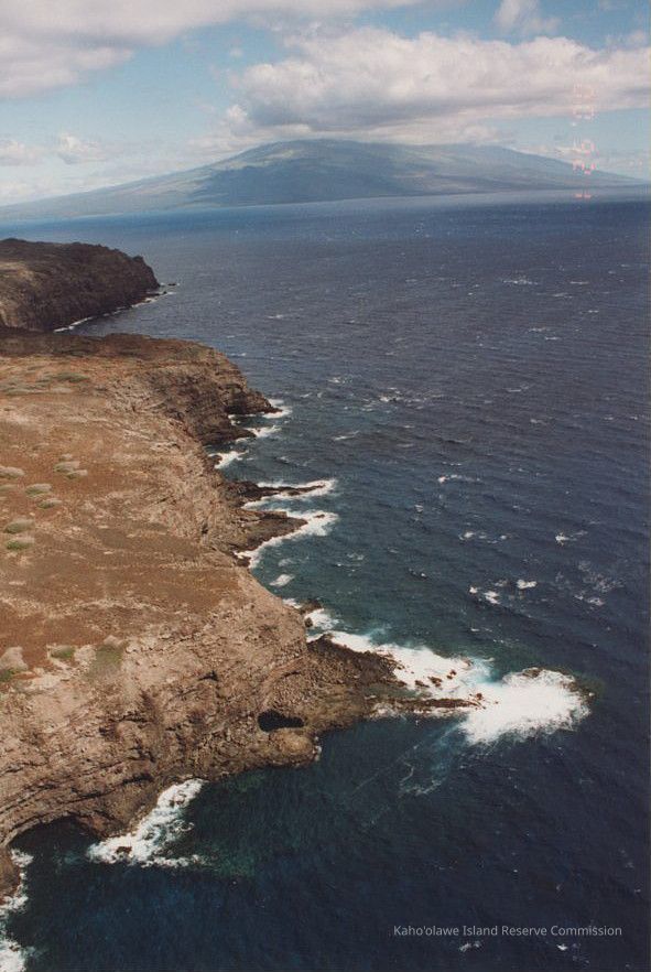 An aerial photo of the point at Lae O Kaka with Haleakalā in the background.