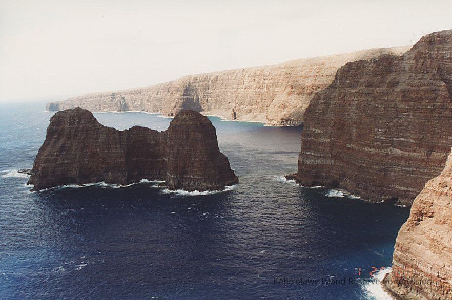 The image shows rugged, steep cliff islands rising from deep blue ocean waters, creating a dramatic and isolated coastline.
