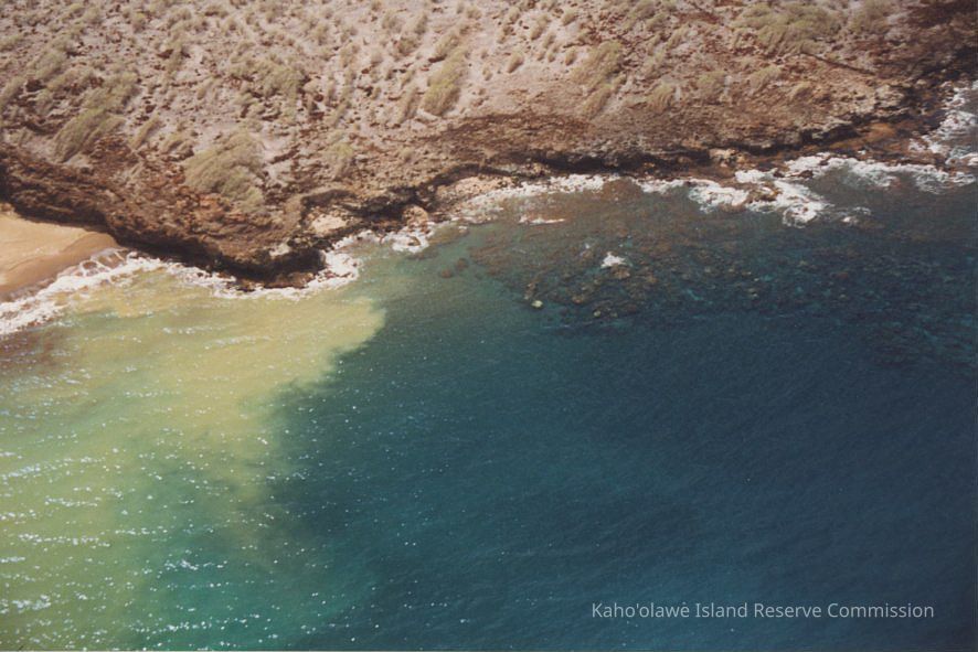 An aerial photo of an unnamed bay northeast of Kaukamoku with soil runoff and coral.Photograph Details