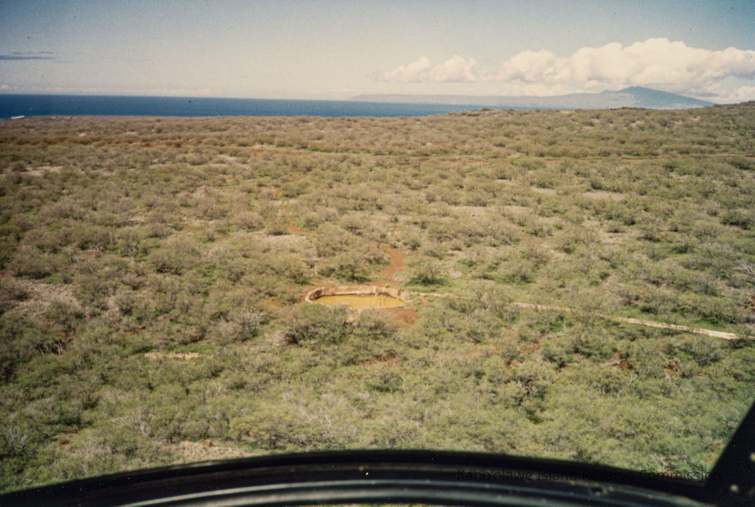 Aerial view shows vast, arid landscape with sparse vegetation stretching towards distant horizon, under a clear blue sky.
