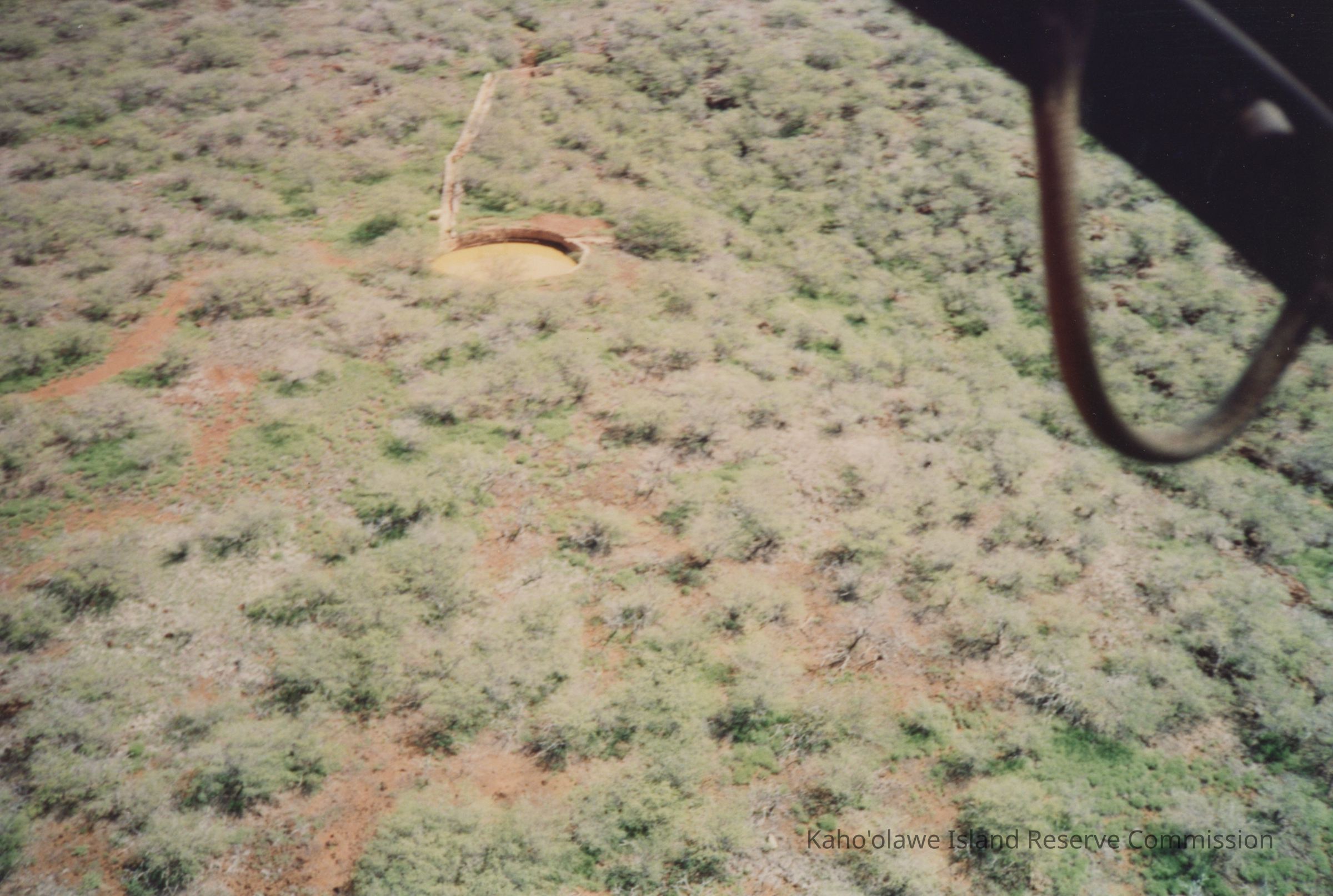 The image shows an aerial view of a landscape with scattered vegetation and a circular, brown structure, possibly a waterhole, amidst the greenery.
