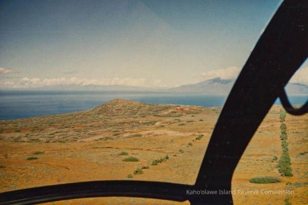 Color aerial photo from helicopter of hardpan terrain, tree lines and other trees with the ocean, Maui and Moloka'i in the far background.Photograph Details