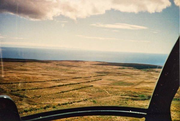Color photograph of an aerial view of hardpan terrain and tree lines taken from a helicopter