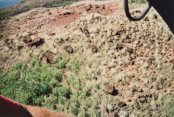 The image shows a rocky terrain with patches of grass, suggesting potential archaeological significance amidst a grassy hardpan landscape.