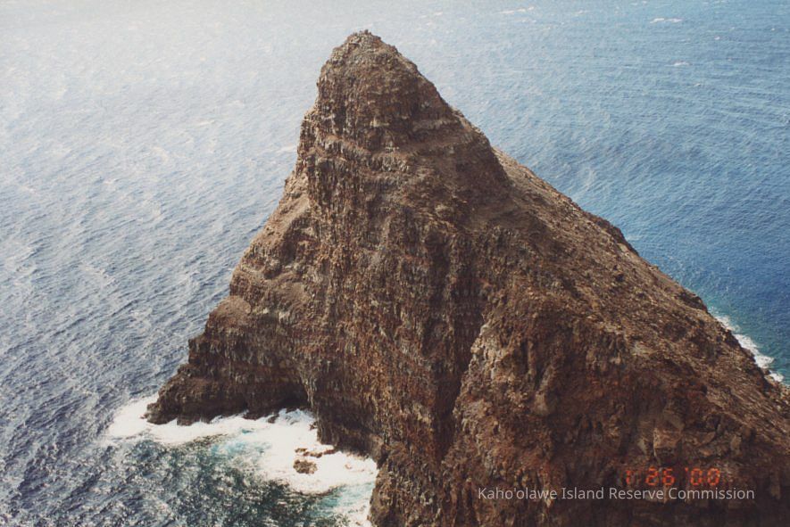 The image shows a rugged, steep rocky island rising sharply from a deep blue sea, with waves crashing against its base, captured under a hazy sky