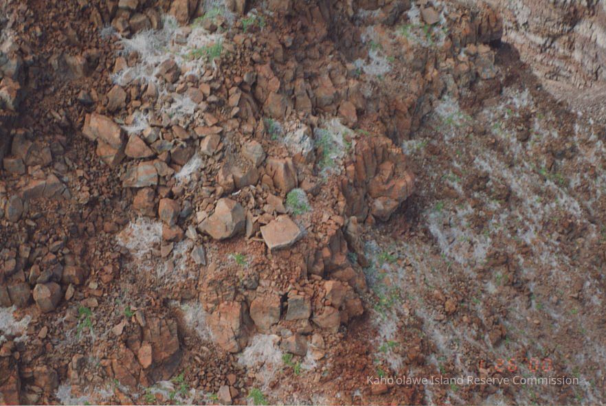 The image captures a rugged, rocky terrain with scattered vegetation, showcasing different shades of brown and red stones.