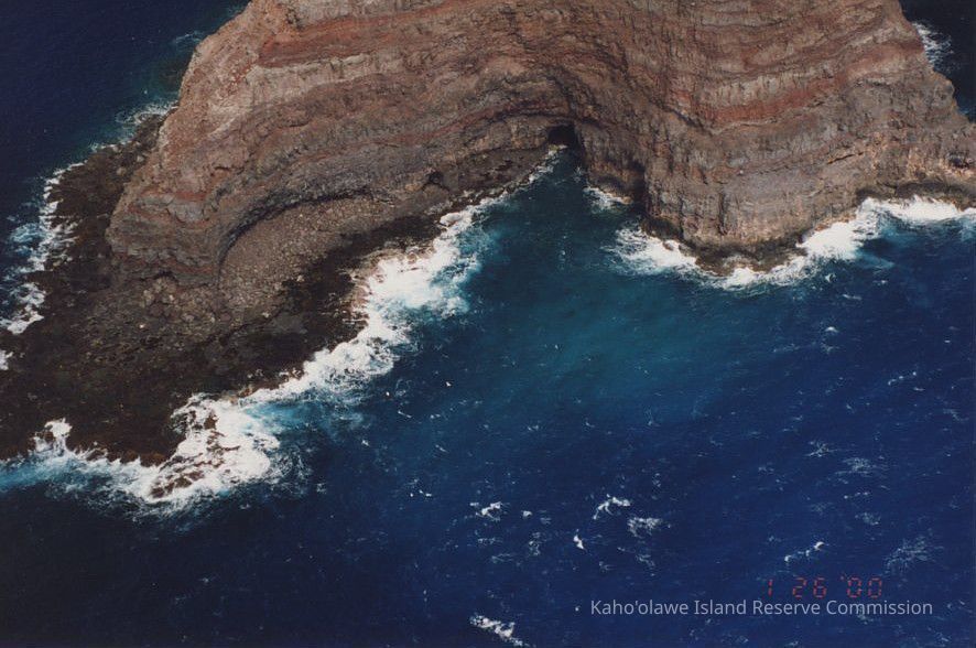 The image shows a rugged island, surrounded by deep blue ocean waters, creating white waves at its edges.