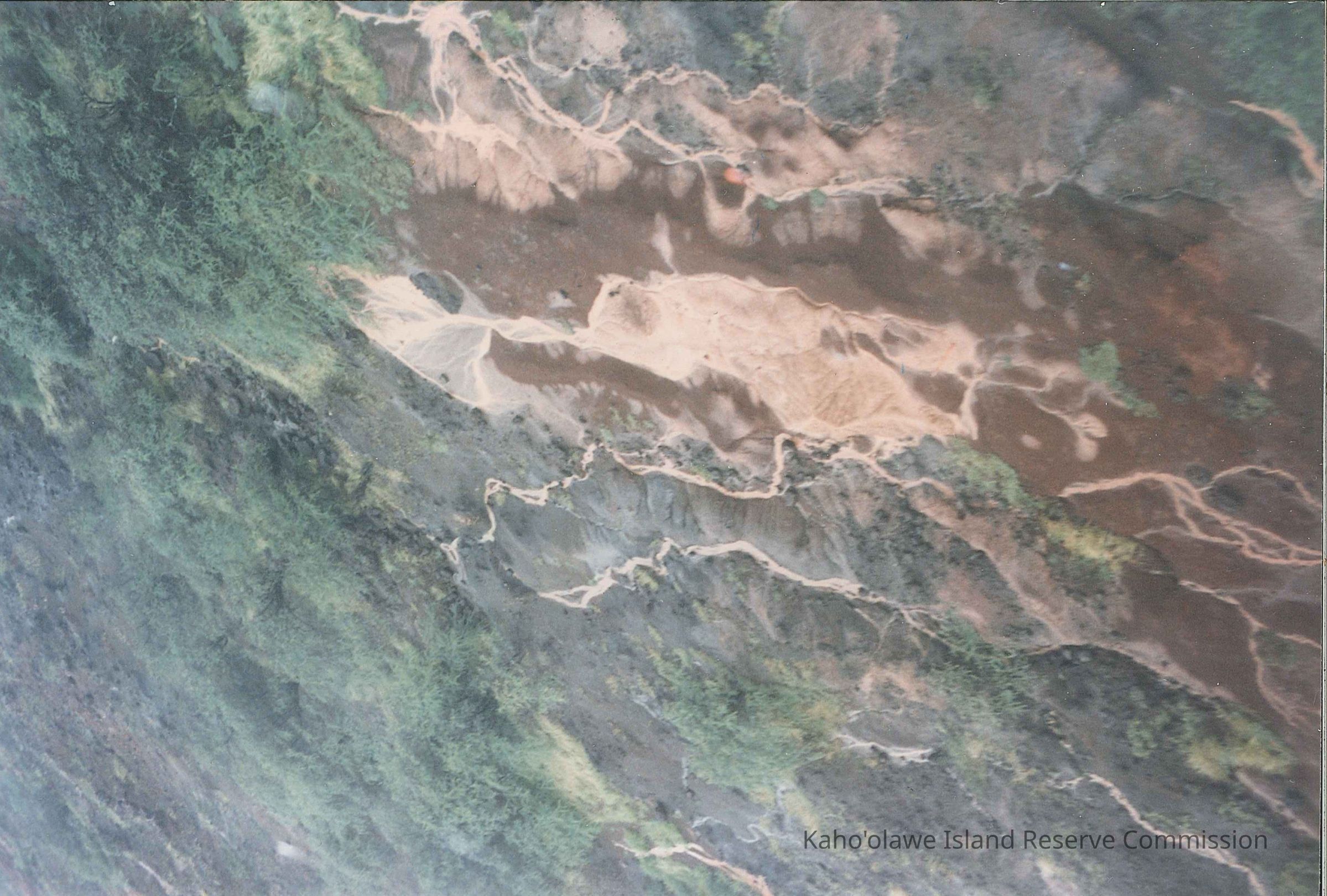 Color aerial photo of water runoff down gullies.