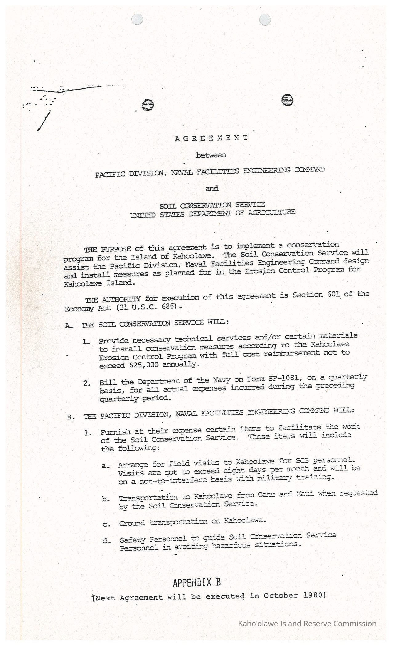 Copy of Agreement between Pacific Division, Naval Facilities Engineering Command and Soil Conservation Service, United States Department of Agriculture "to implement a conservation program for the Island of Kahoolawe." Two xerographically copied 8.5" x 14" black and white pagesCreator