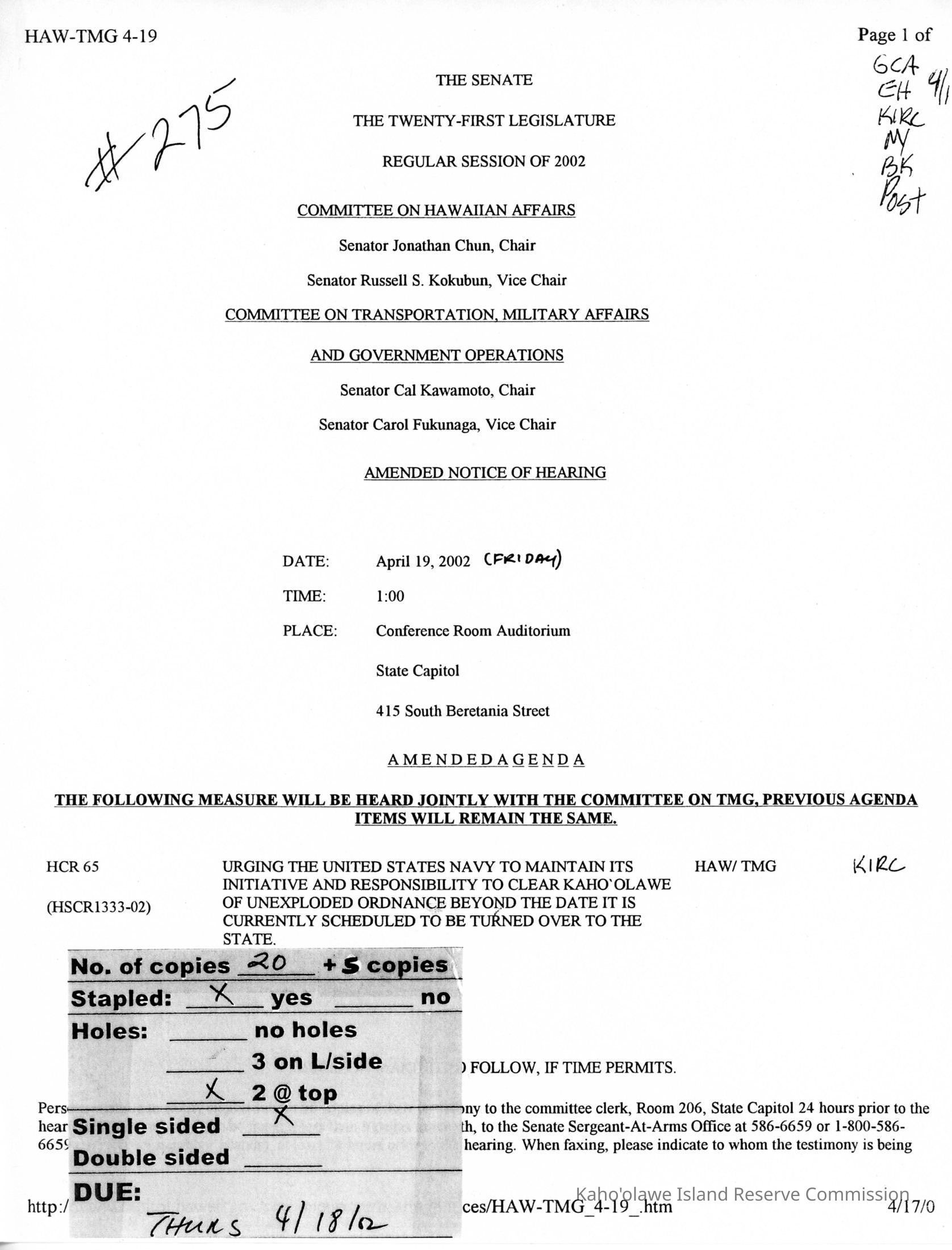 The Senate, The Twenty-First Legislature, Regular Session of 2002, Committee on Hawaiian Affairs, Committee on Transportation, Military Affairs and Government Operations, Amended Notice of Hearing for April 19, 2002. One copied letter size page.Creator