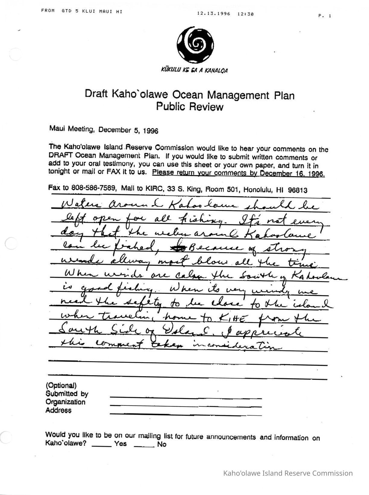 Faxed (received on December 13, 1996) testimony/comments on Draft Kaho'olawe Ocean Management Plan at Maui Meeting, December 5, 1996 from an anonymous person.Creator