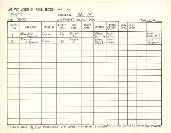 Completed Artifact Accession Field Record form recording list of samples/artifacts collected from Site 136D. One 8.5" x 11" pageCreator