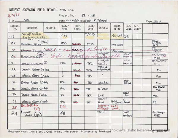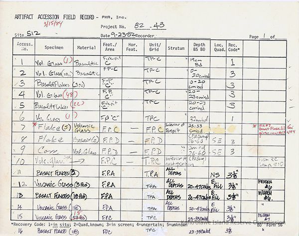 Completed Artifact Accession Field Record forms recording list of samples/artifacts collected from Site 512. 2 8.5" x 11" pagesCreator