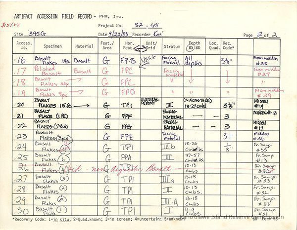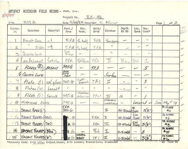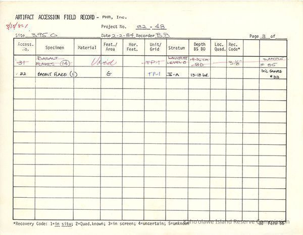 Completed Artifact Accession Field Record form recording list of samples/artifacts collected from Site 395 Feature G. 3 8.5" x 11" pagesCreator