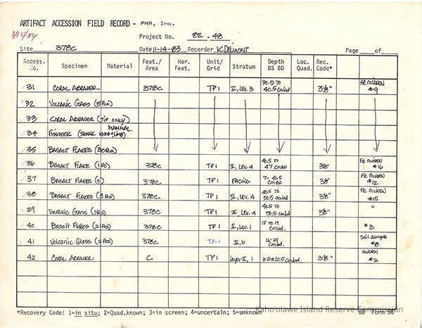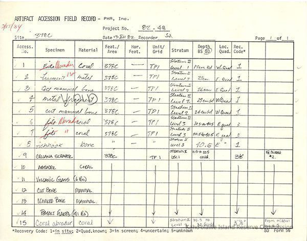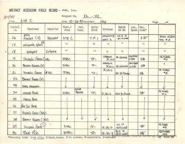 Completed Artifact Accession Field Record form recording list of samples/artifacts collected from Site 378 Feature C. 3 8.5" x 11" pagesCreator