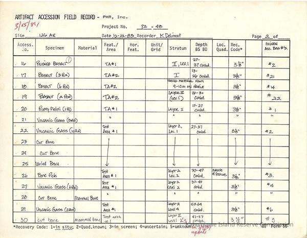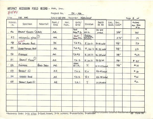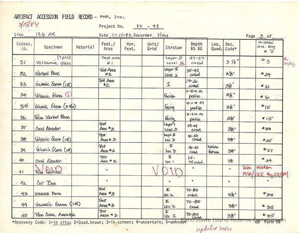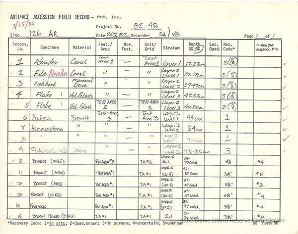 Completed Artifact Accession Field Record forms recording list of samples/artifacts collected from Site 126AR. Four 8.5" x 11" pagesCreator