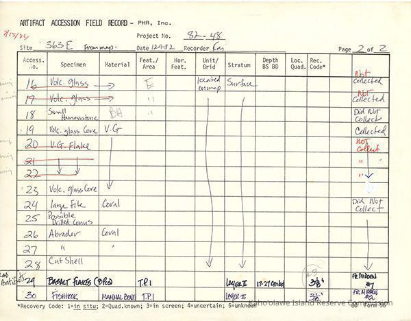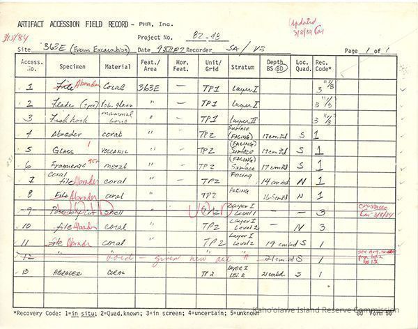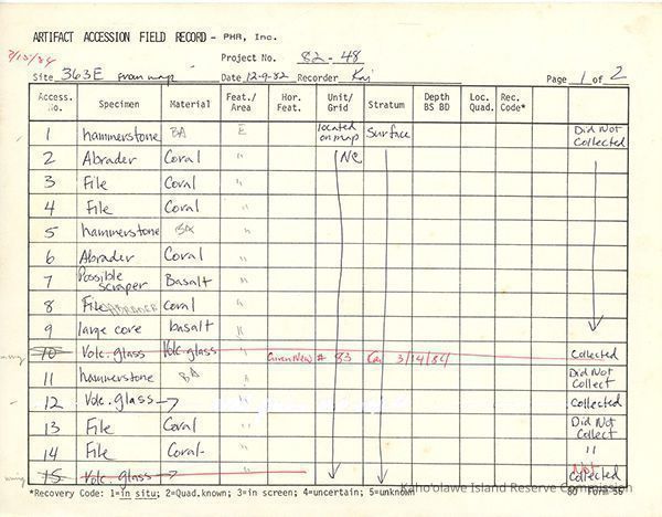 Completed Artifact Accession Field Record form recording list of samples/artifacts collected from Site 363 Feature E. 5 8.5" x 11" pagesCreator