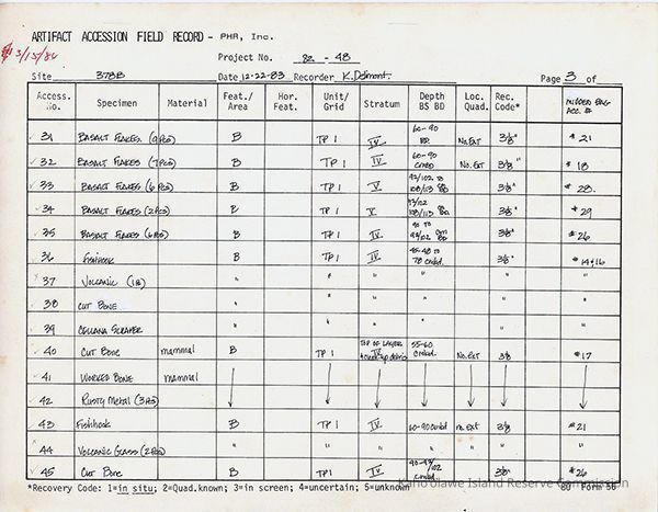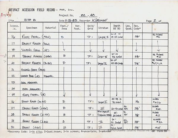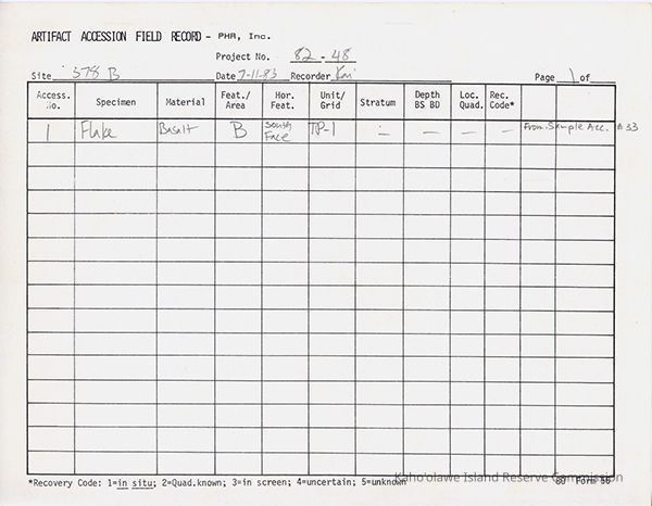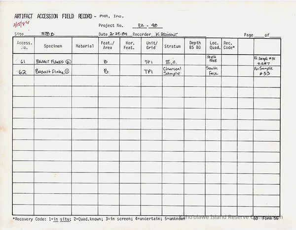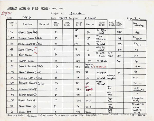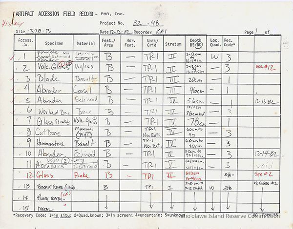 Completed Artifact Accession Field Record form recording list of samples/artifacts collected from Site 378 Feature B. Form updated on 15 March 1984 with red ink notations. Six 8.5" x 11" pages.Creator