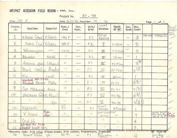 Completed Artifact Accession Field Record forms recording list of samples/artifacts collected from Site 121F. Three 8.5" x 11" pagesDate(s) of Creation