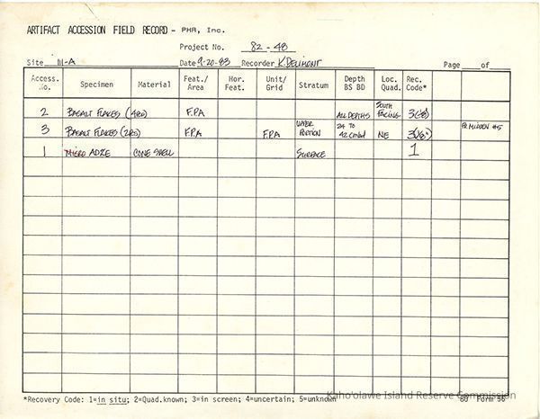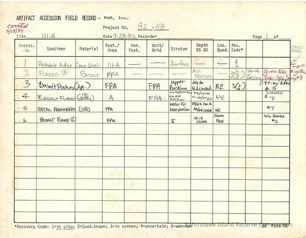 Completed Artifact Accession Field Record form recording list of samples/artifacts collected from Site 111-A. 2 8.5" x 11" pagesCreator