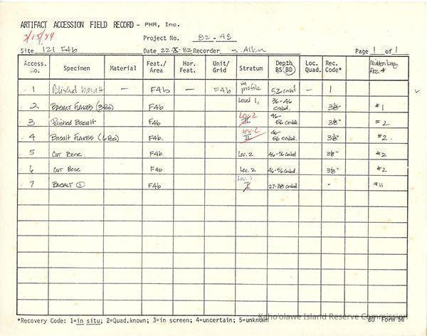 Completed Artifact Accession Field Record form recording list of samples/artifacts collected from Site 121 F4b. Form was updated 15 March 1984 with red ink notations.Creator