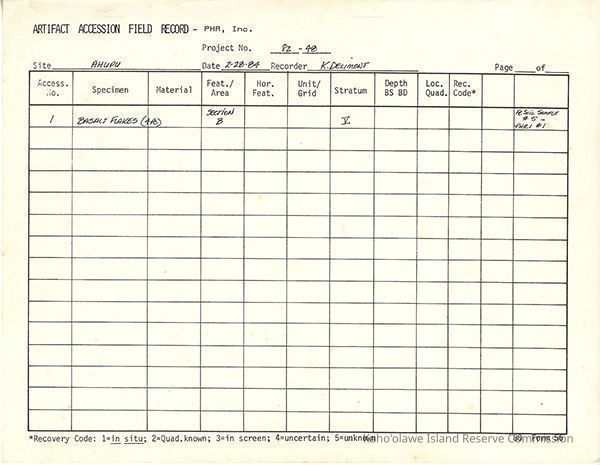 Completed Artifact Accession Field Record form recording list of samples/artifacts collected from Ahupū site. One 8.5" x 11" page.Creator