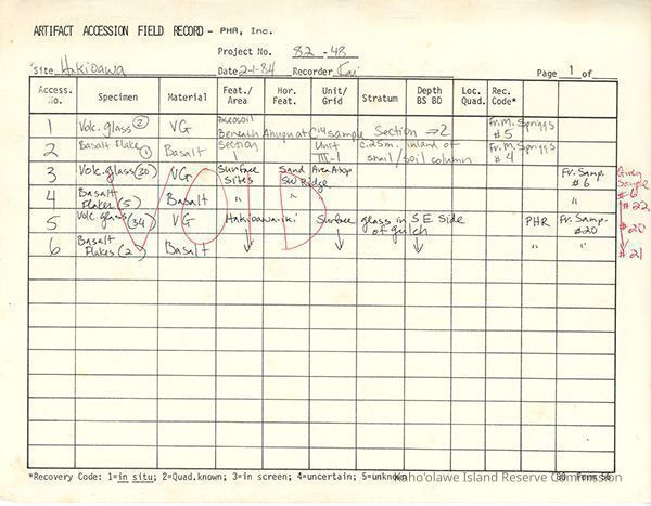 Completed Artifact Accession Field Record form recording list of samples/artifacts collected from Hakioawa. One 8.5" x 11" page.Creator