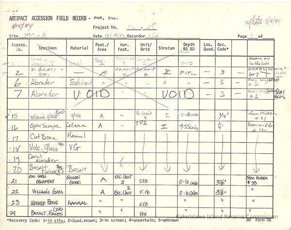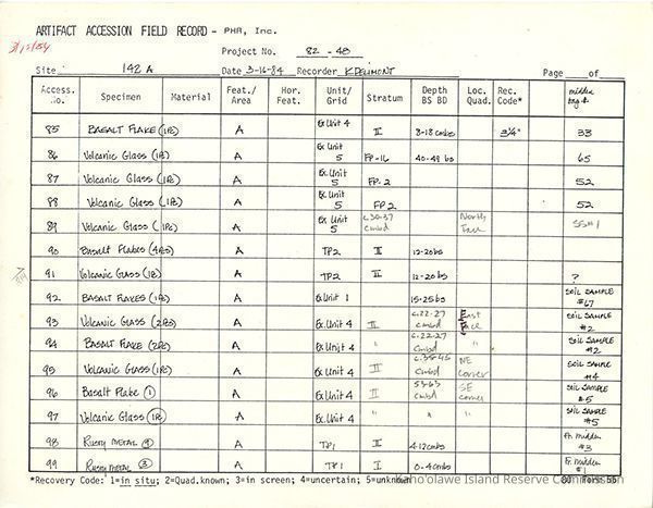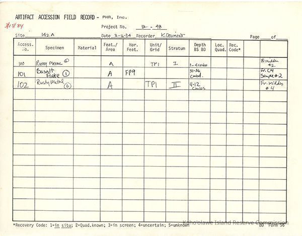 Completed Artifact Accession Field Record form recording list of samples/artifacts collected from Site 142A. Three 8.5" x 11" pagesCreator