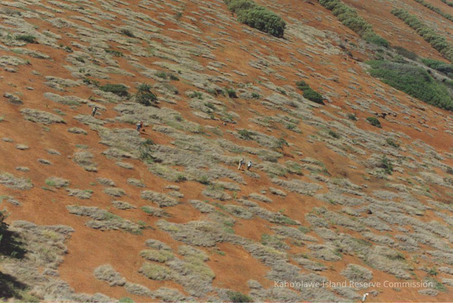An aerial shot of an assessment team on the lower southern slope of Pu'u 'O Moa'ula Nui in the K-2 area, Kahoolawe. There are two copies of image.Collection