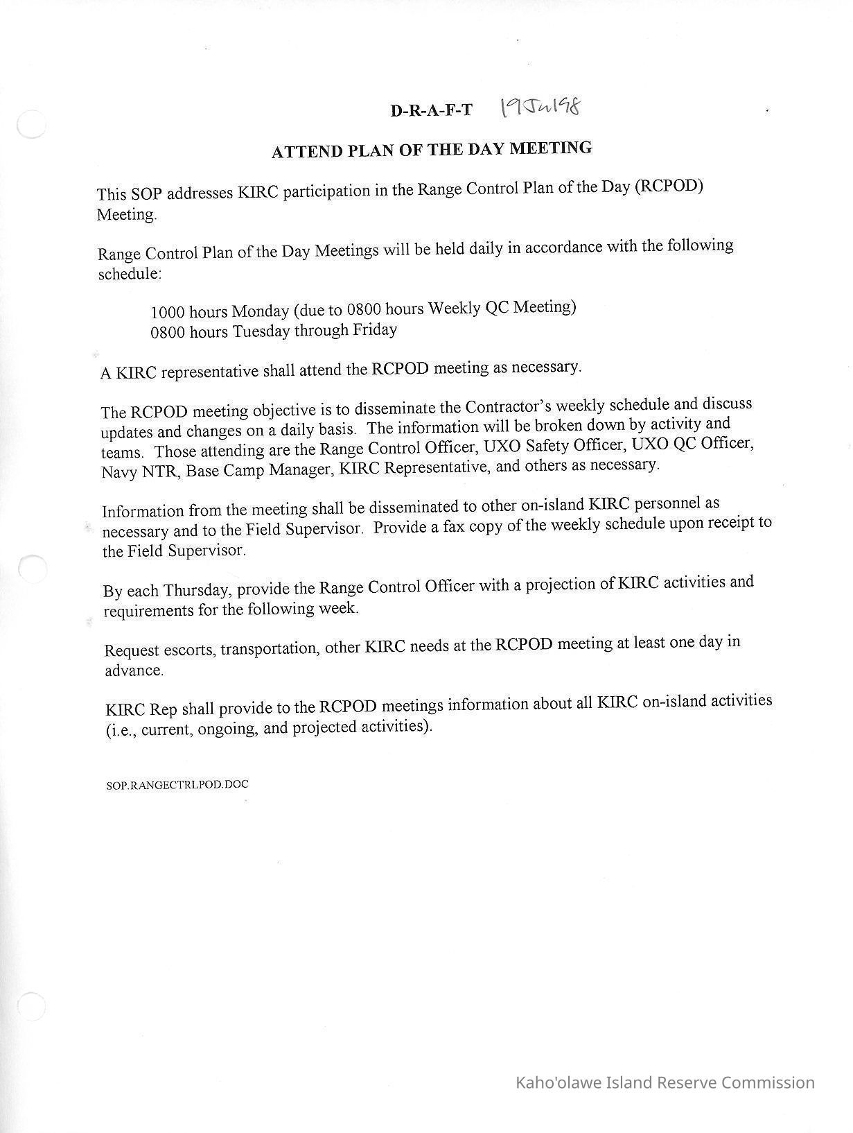 Draft of Attend Plan of the Day Meeting document. One black and white 8.5" x 11" pageCreator