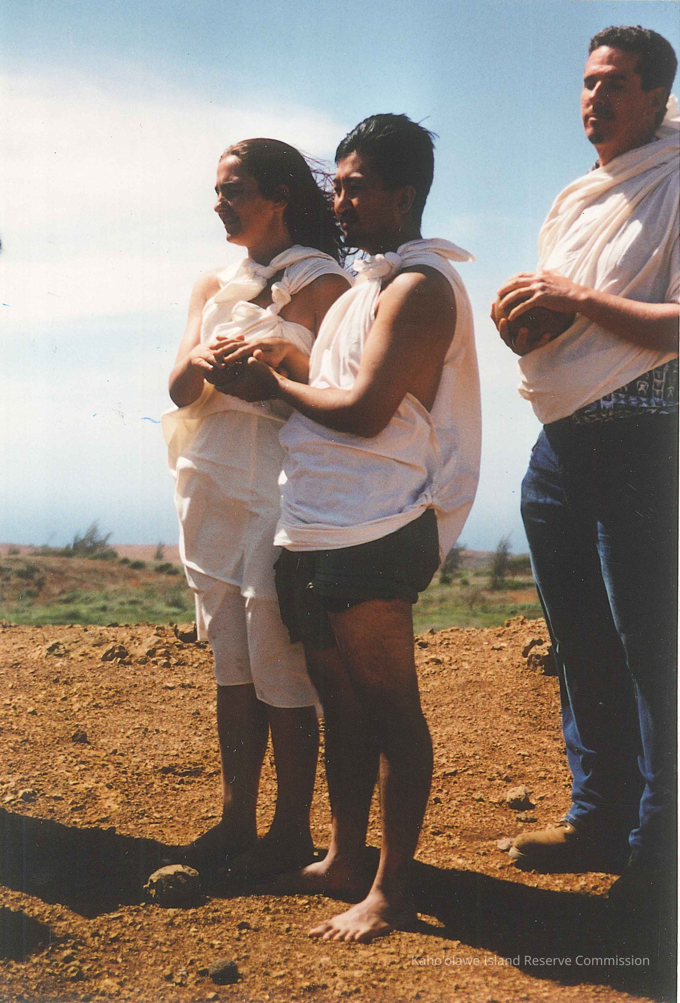 Three people in kihei awaiting during ceremony at rain ko'a on Puu O Moaulanui. Left to right: Davianna McGregor, Burt Sakada and Keoni Fairbanks.