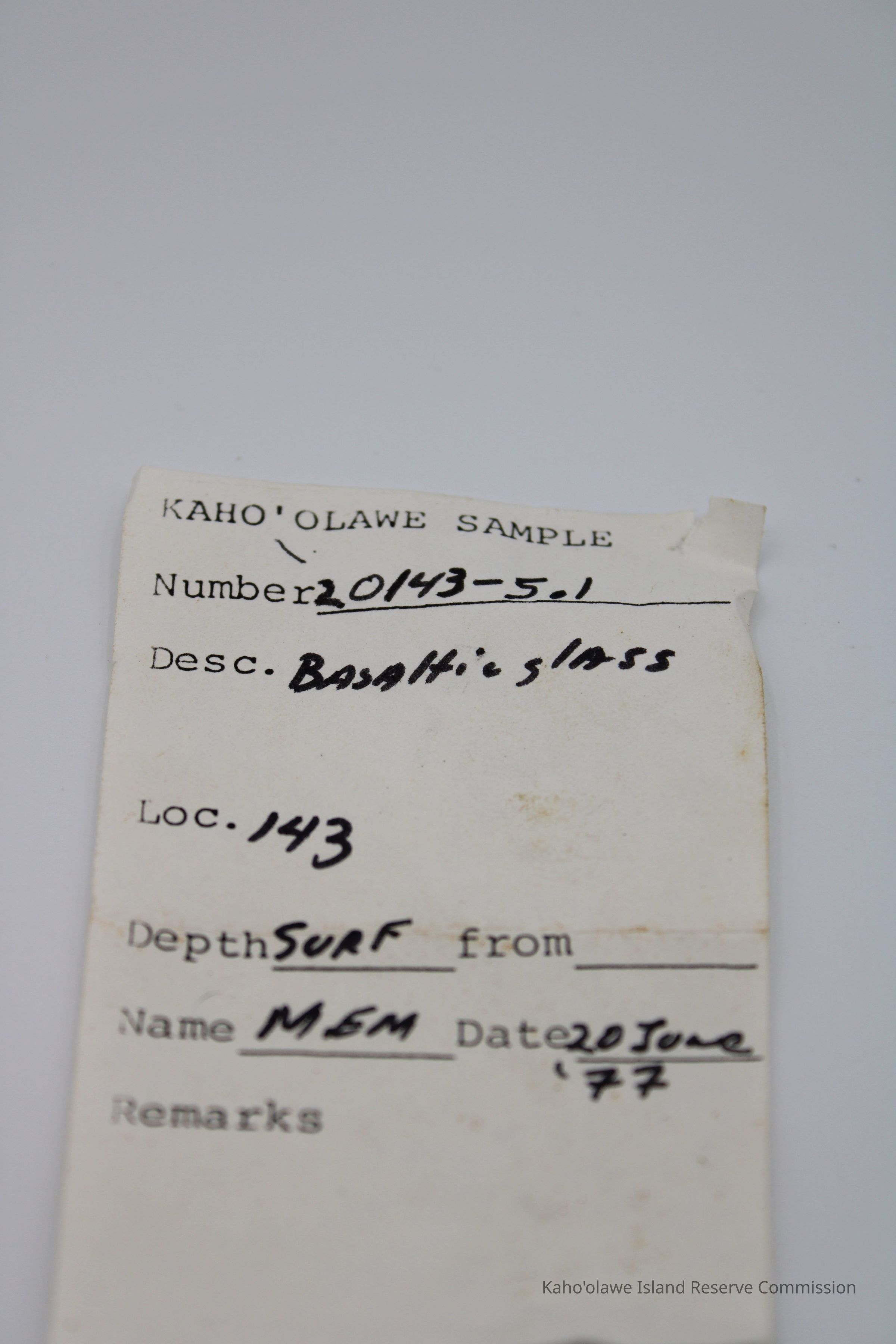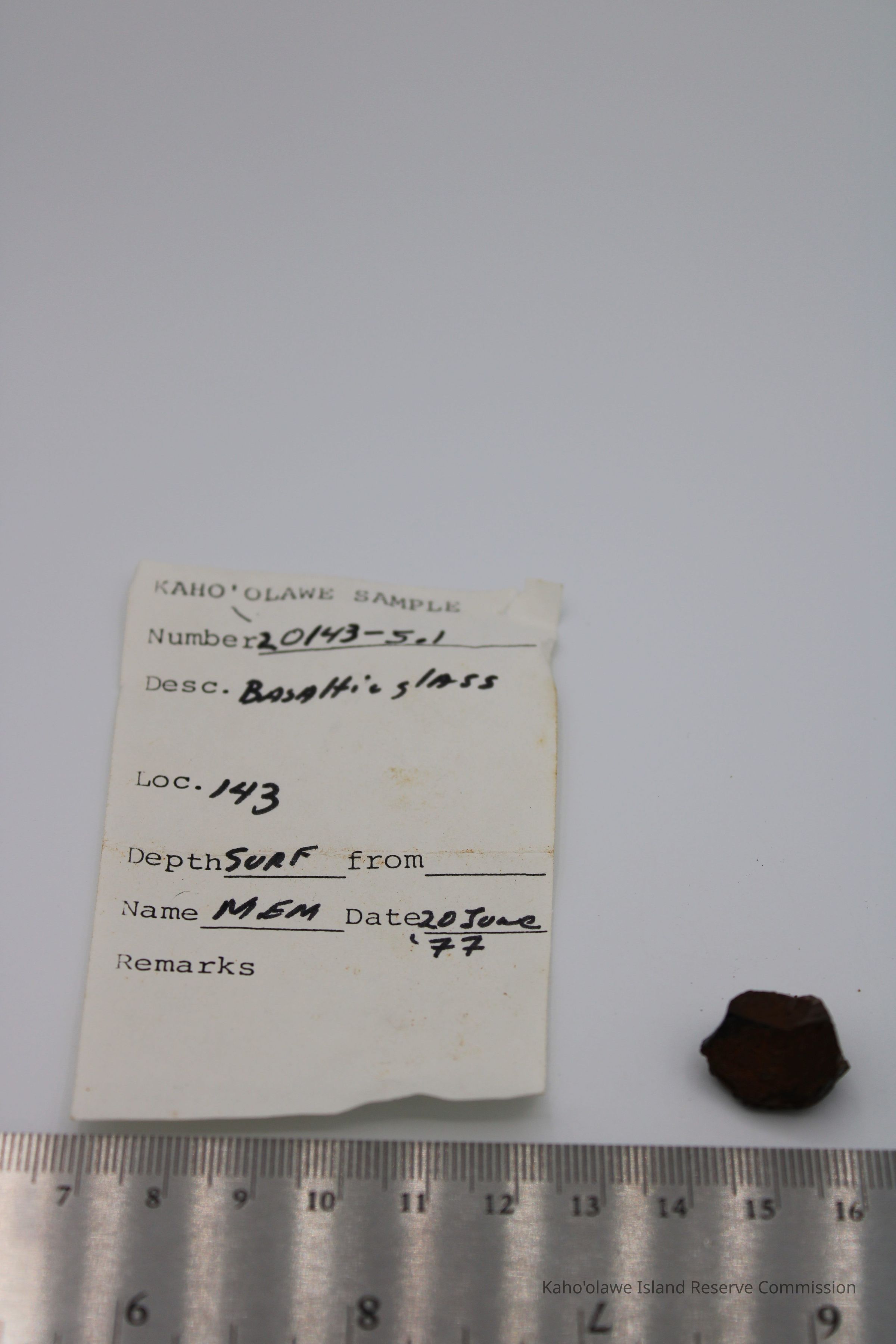 The image shows a sample of basaltic glass accompanied by a labeled form, detailing location Site 143 and dated June 20, 1977, alongside a metal ruler.