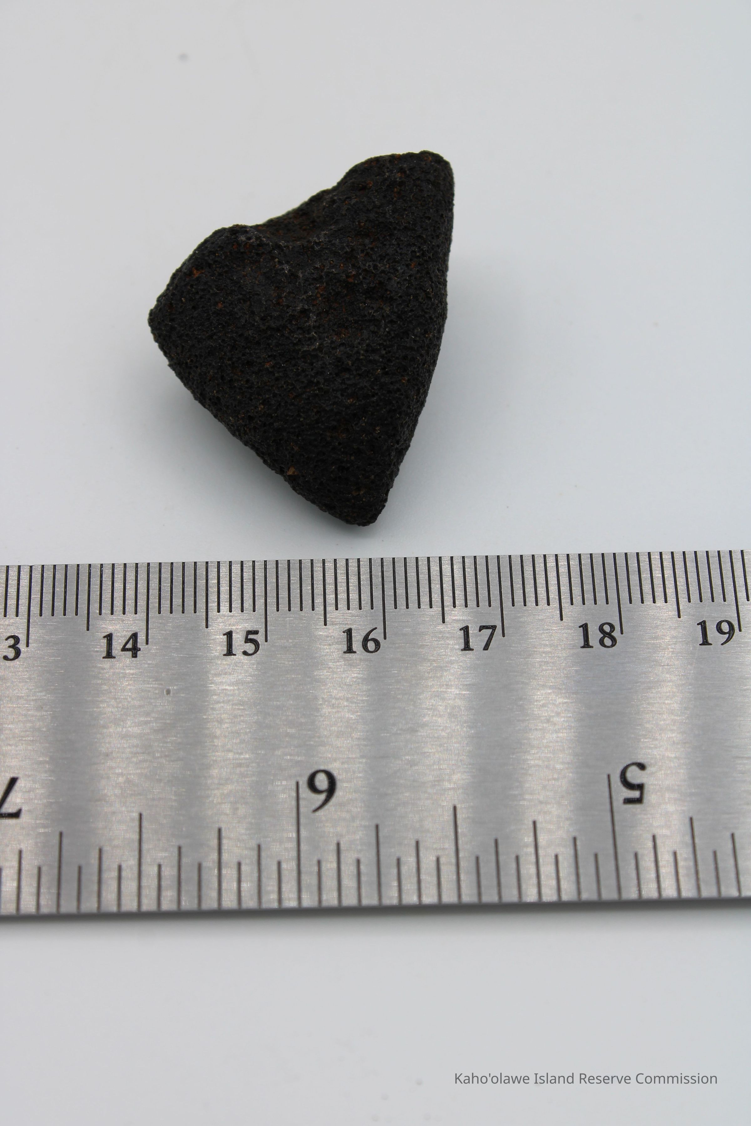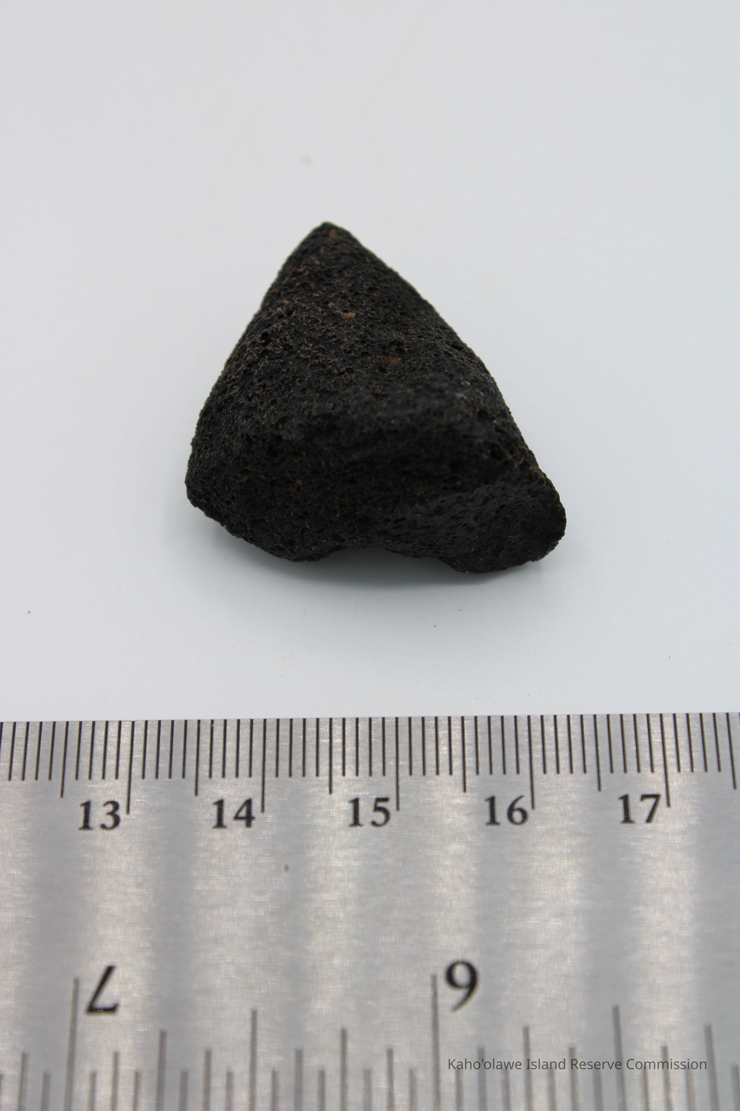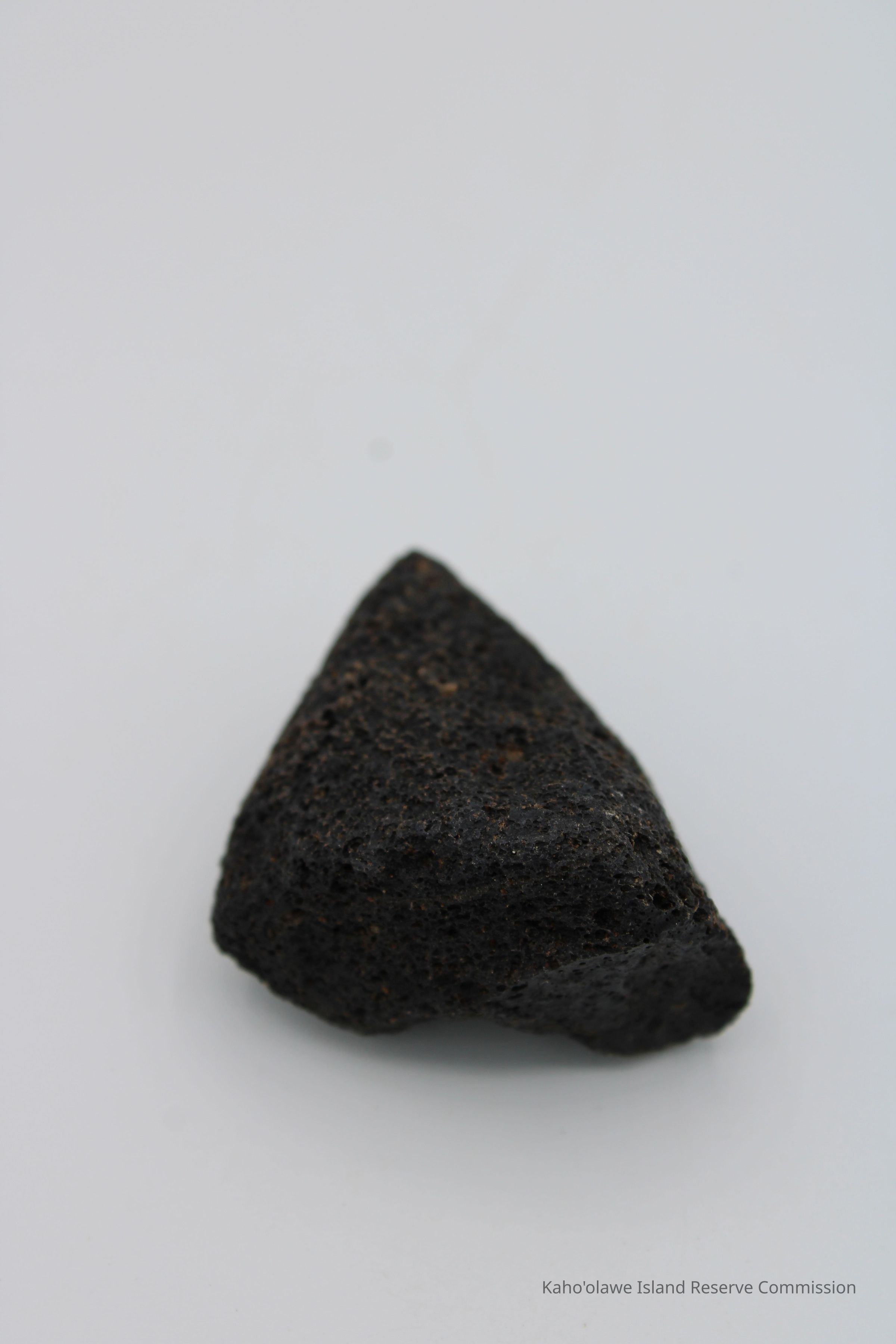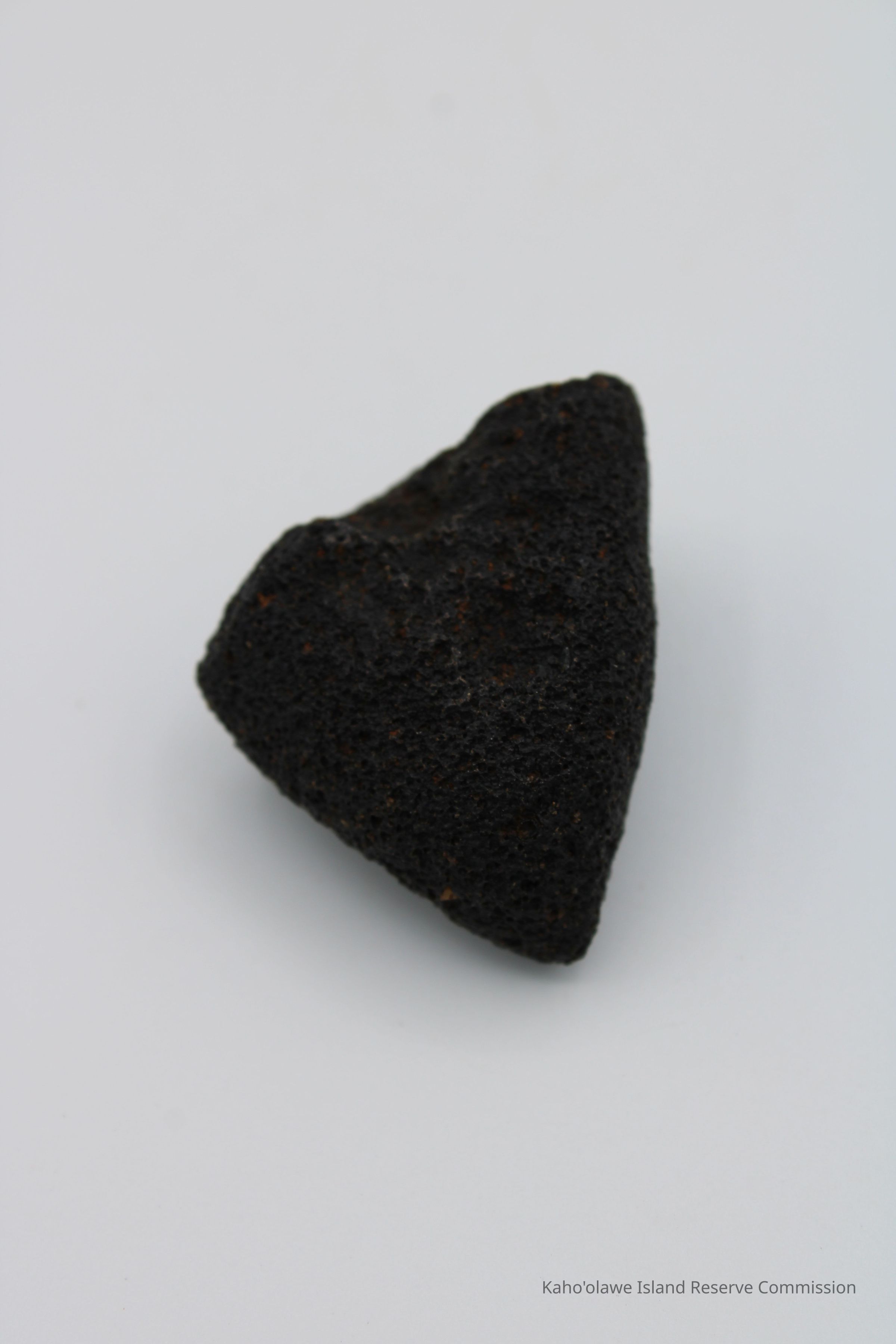 Triangular-shaped core of basaltic glass with holes on one side.Collection