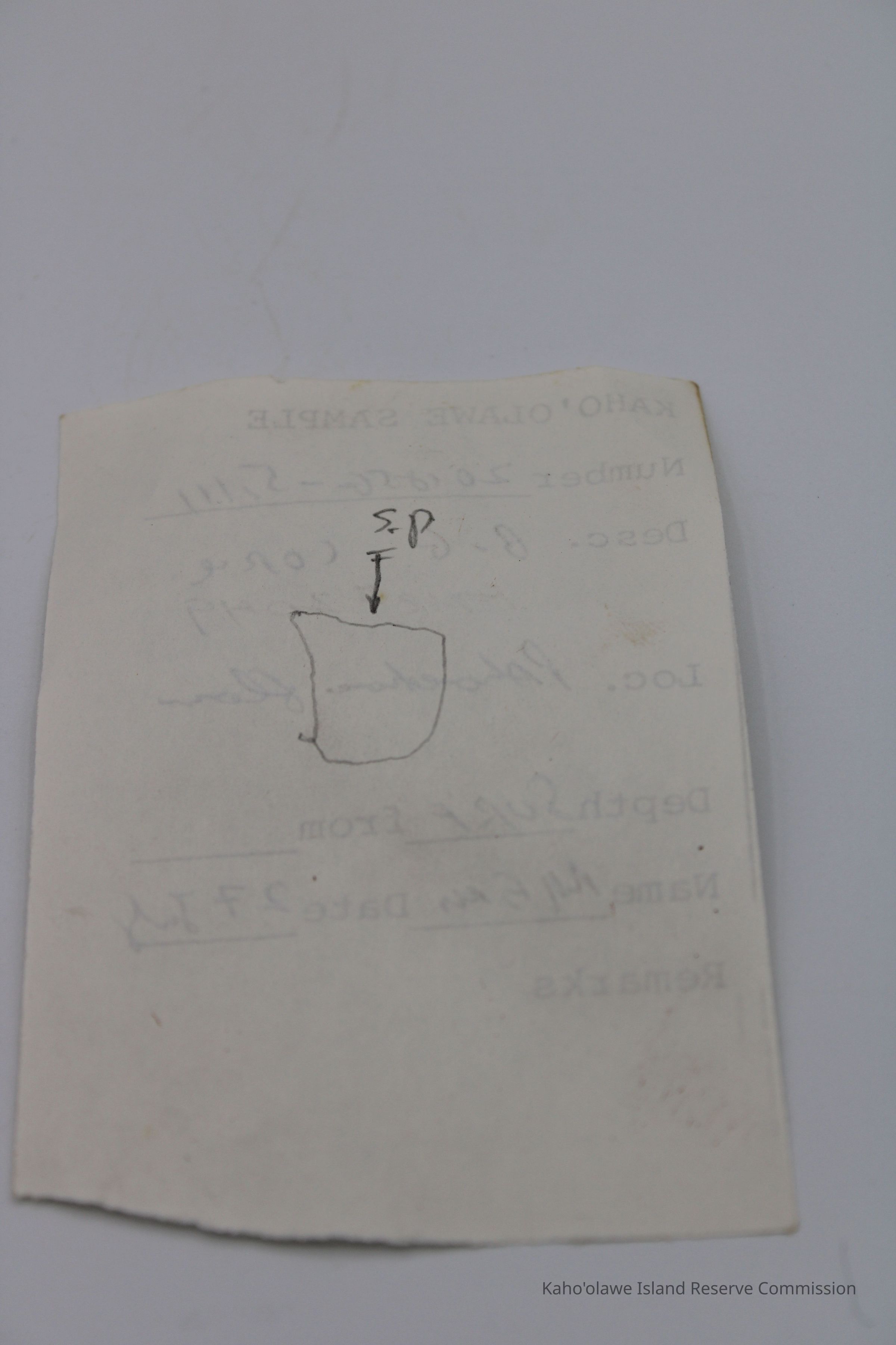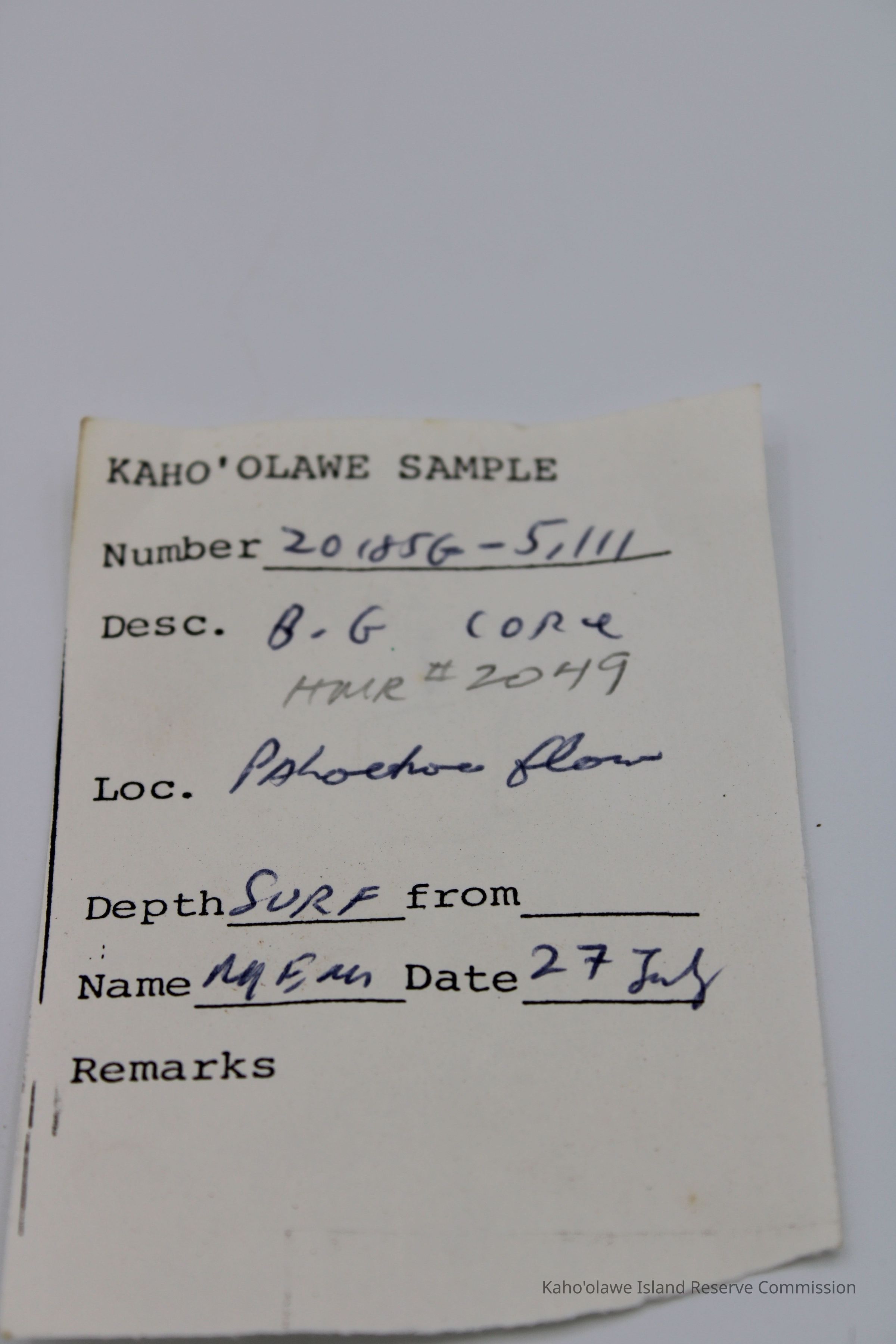 Basaltic glass core from pahoehoe flow; missing; only artifact slip and bag located. May have been sent for analysis.Collection