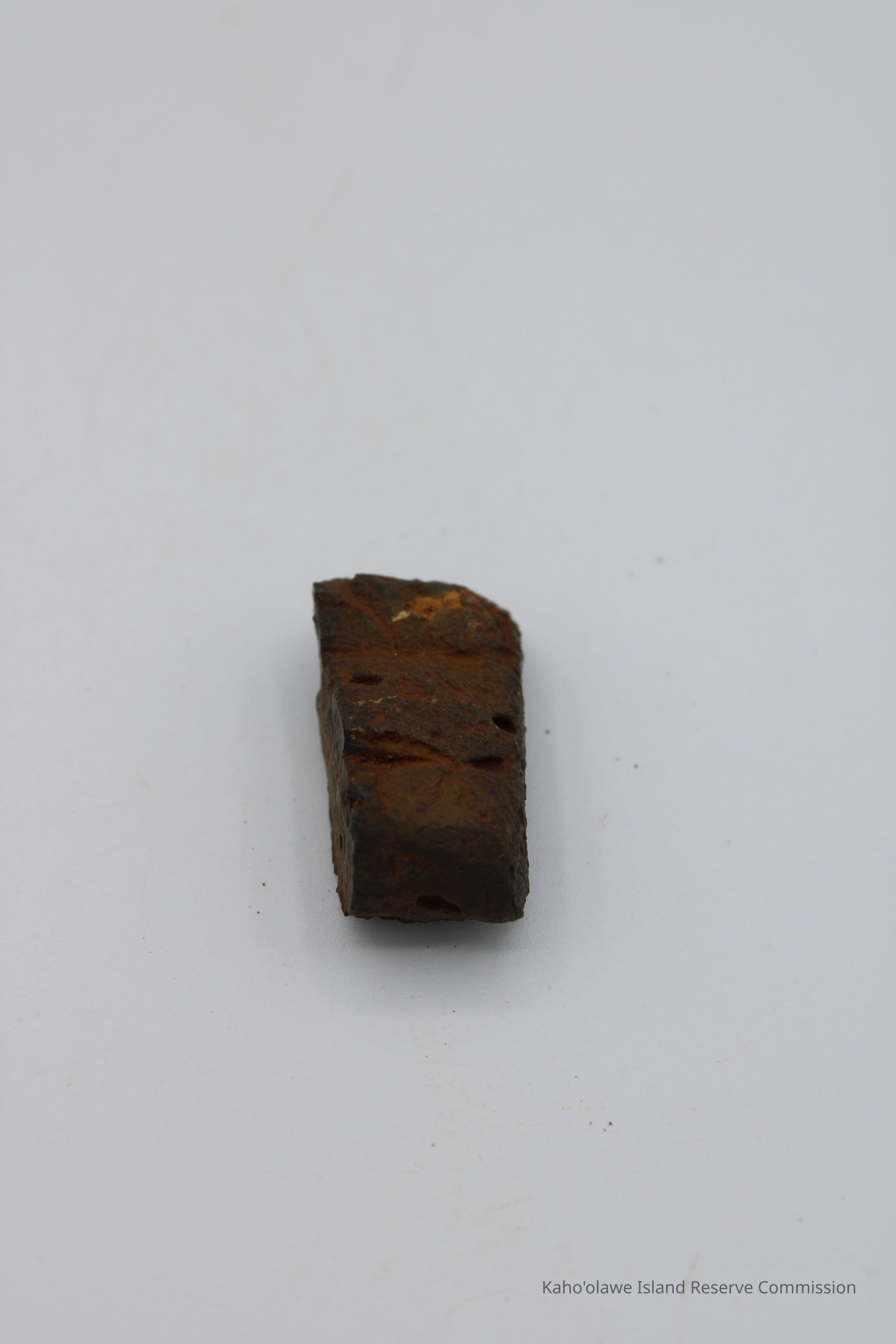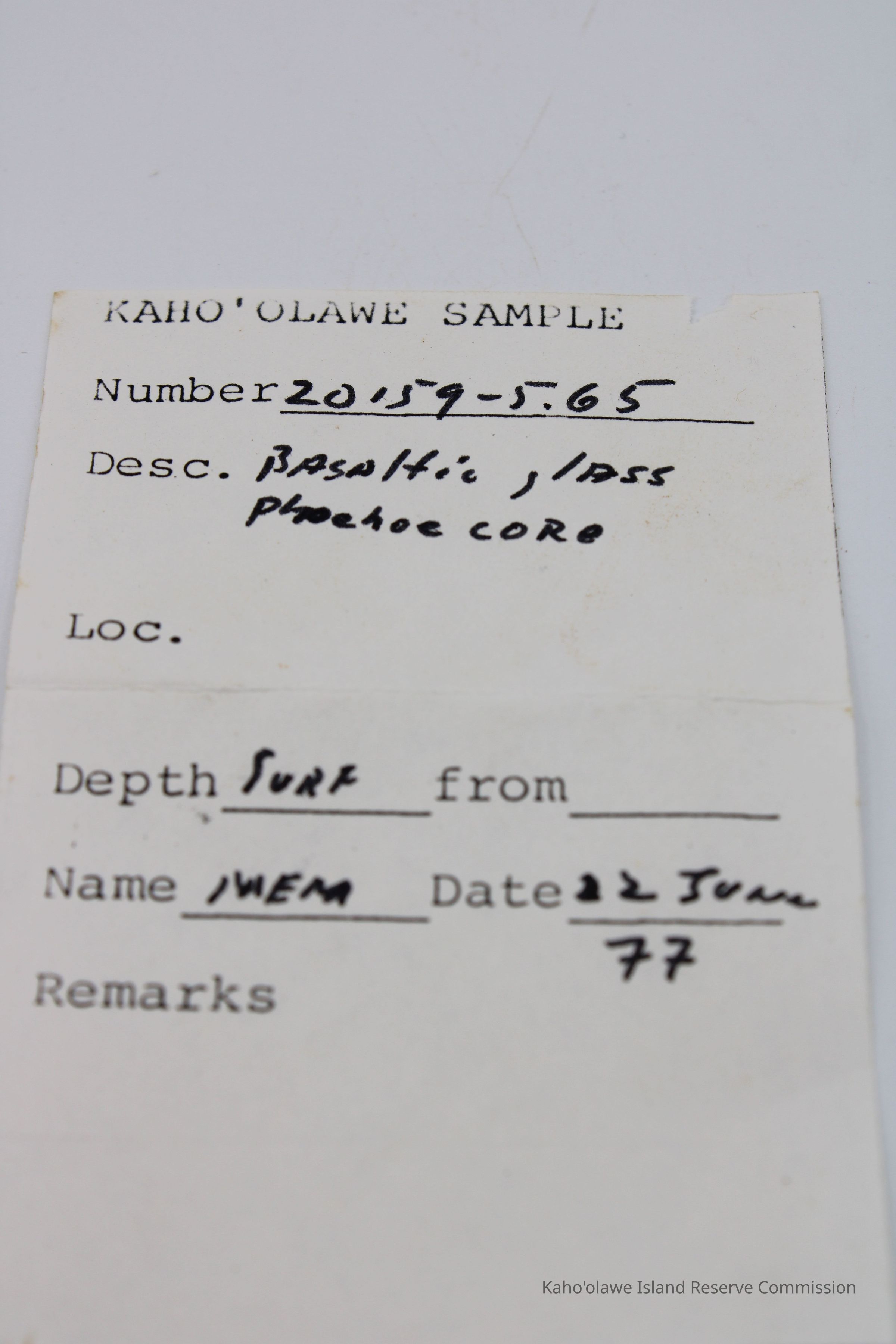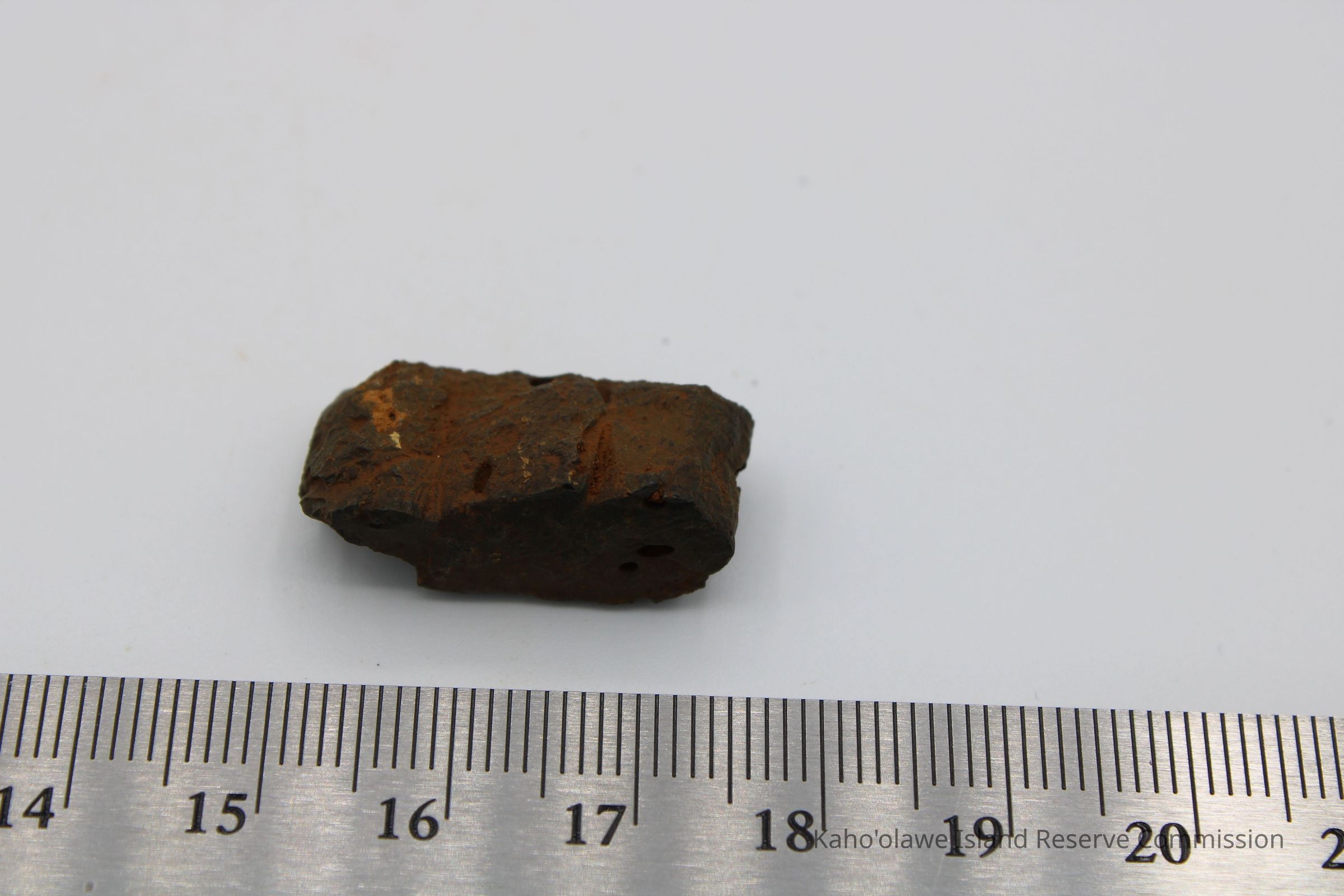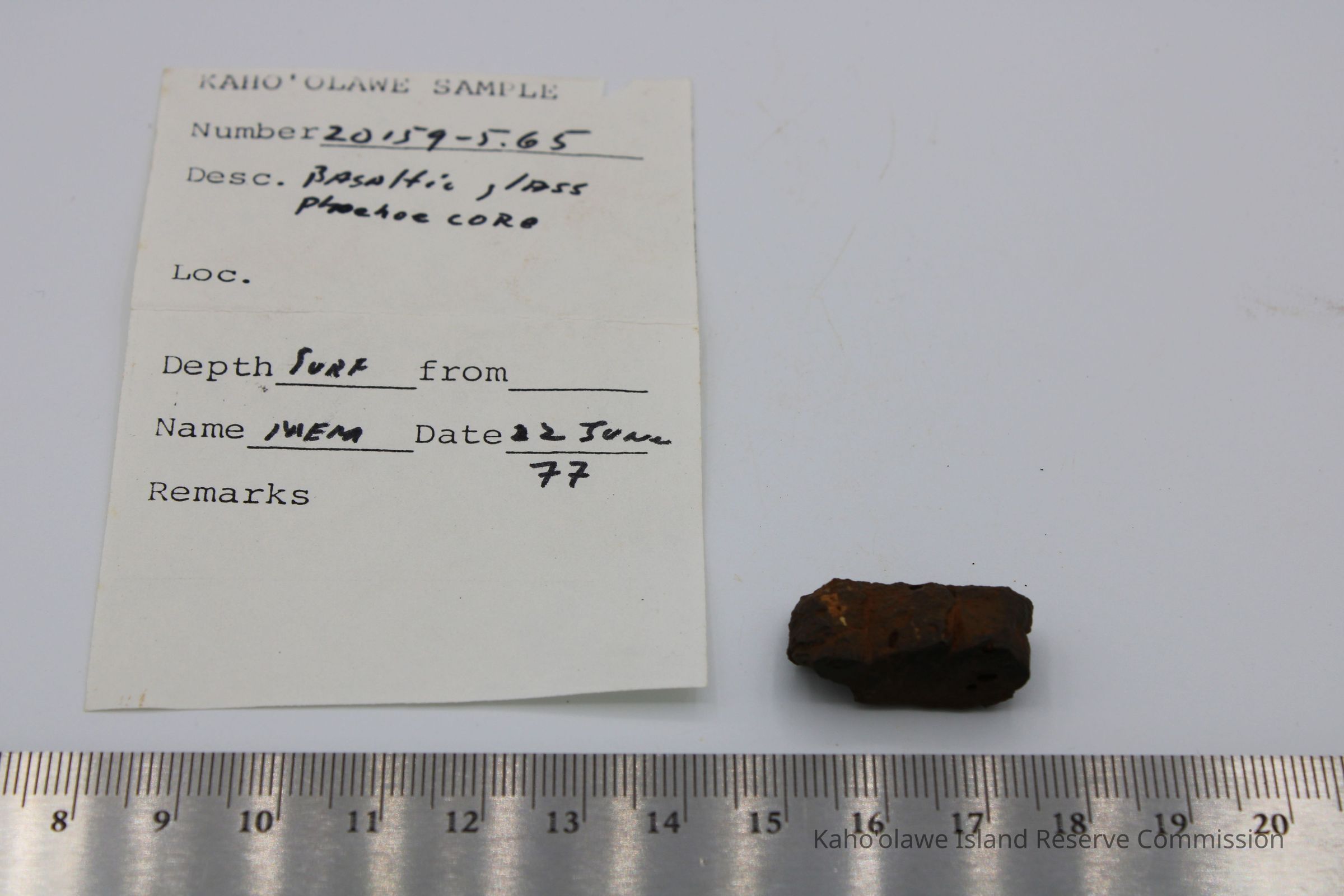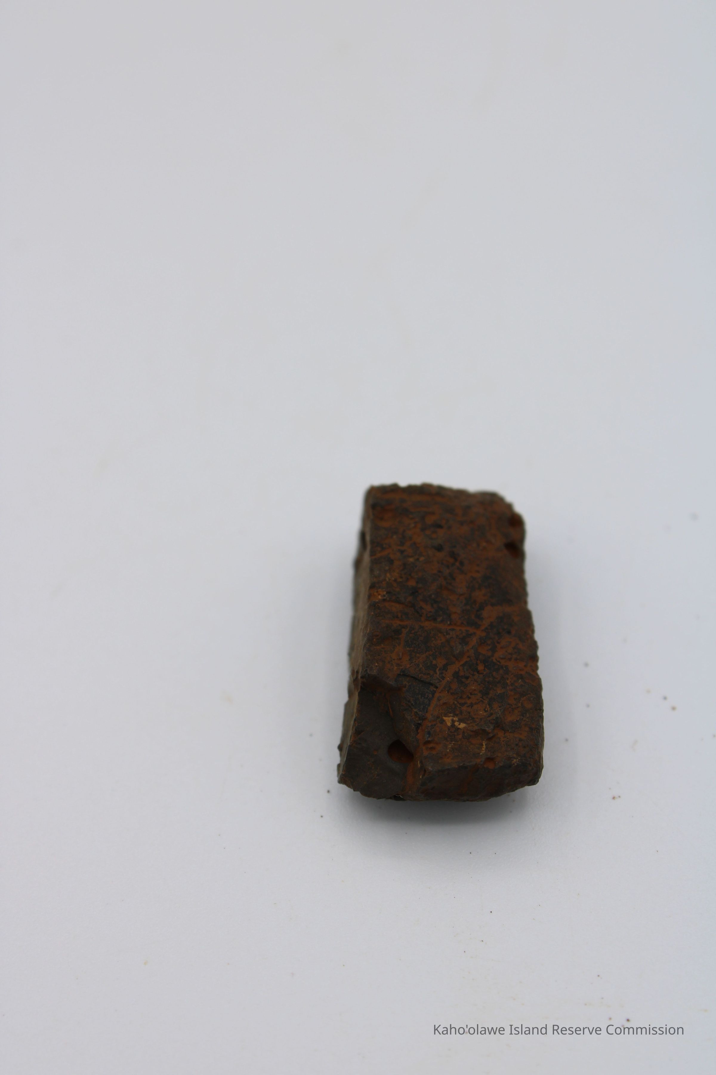 An oblong piece of pāhoehoepahoehoe (smooth, undulating, or ropey lava)/basaltic glass core.Collection