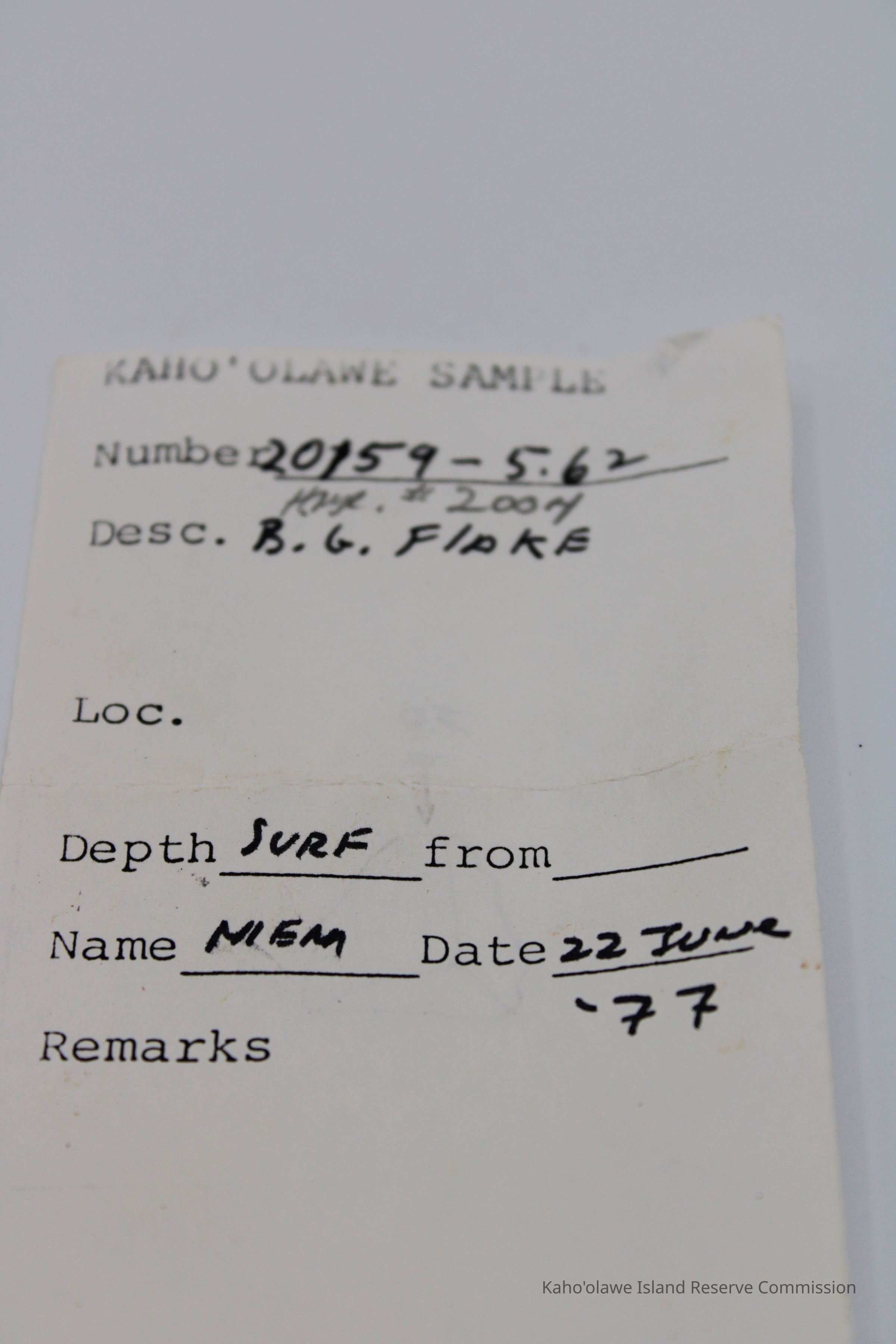 Basaltic glass flake; was sent for analysis. Only storage bag and container in collection.Collection