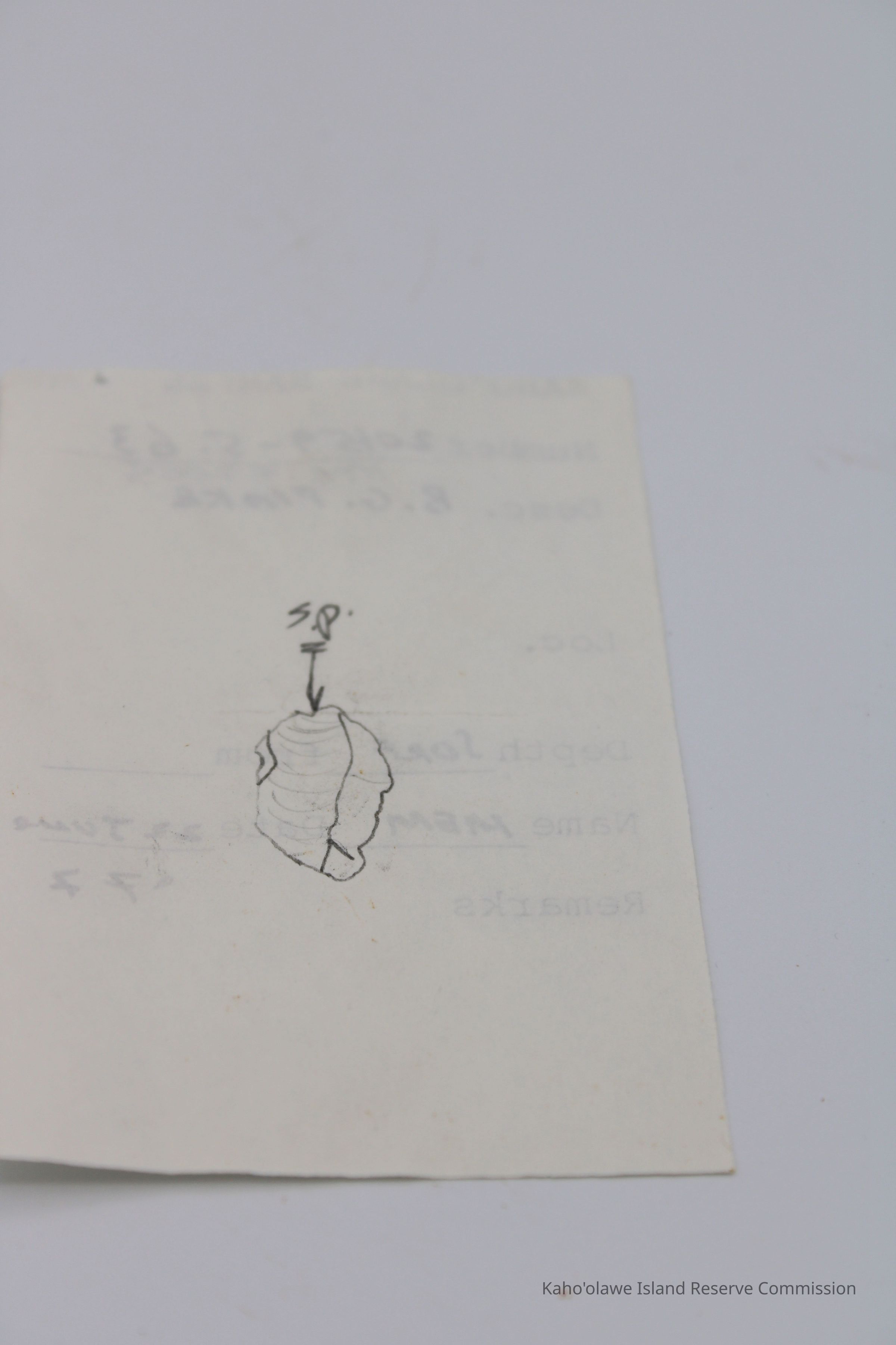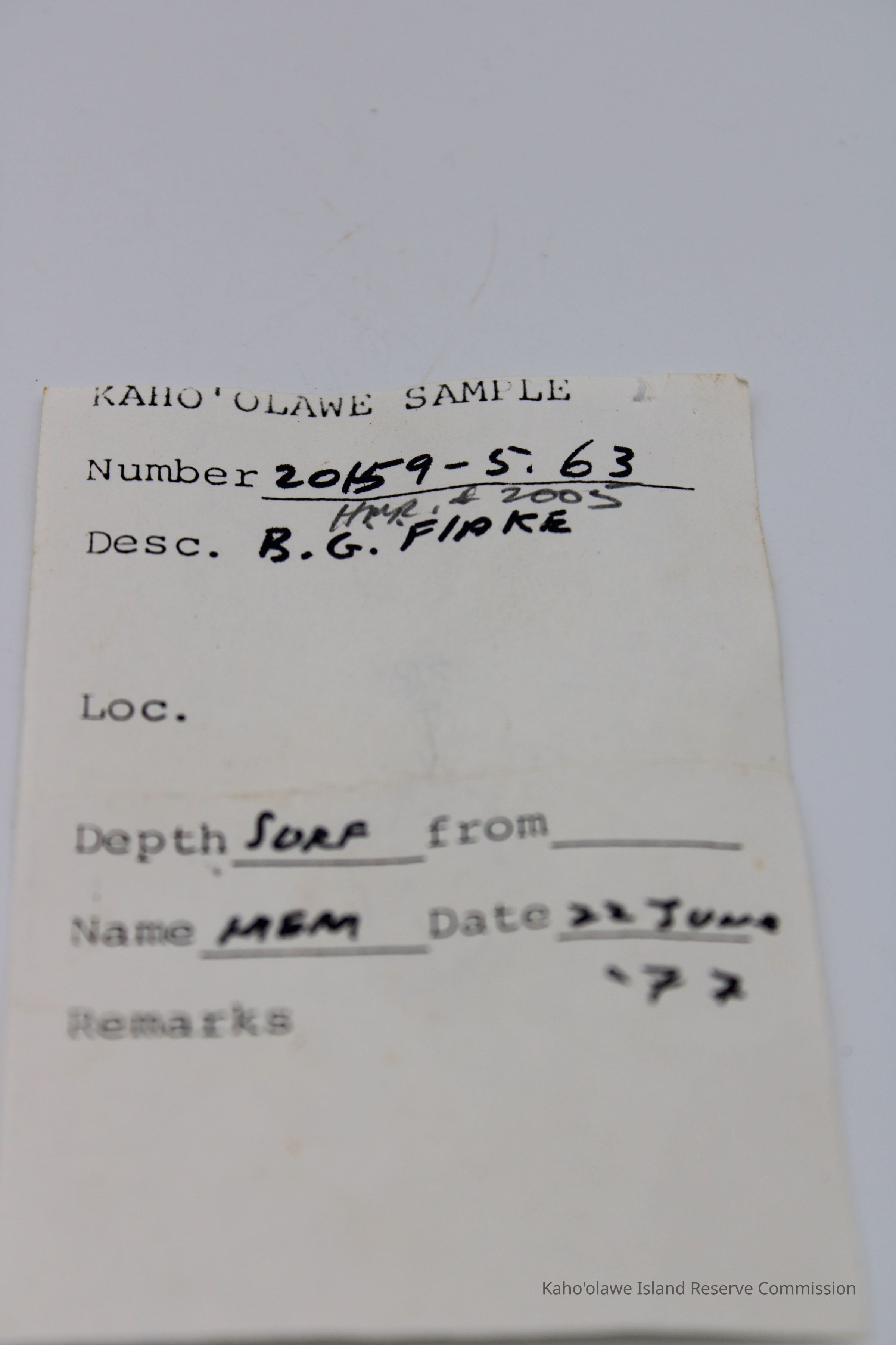 Basaltic glass flake; may have been sent for analysis. Only original bag and artifact slip are in the collection.Collection
