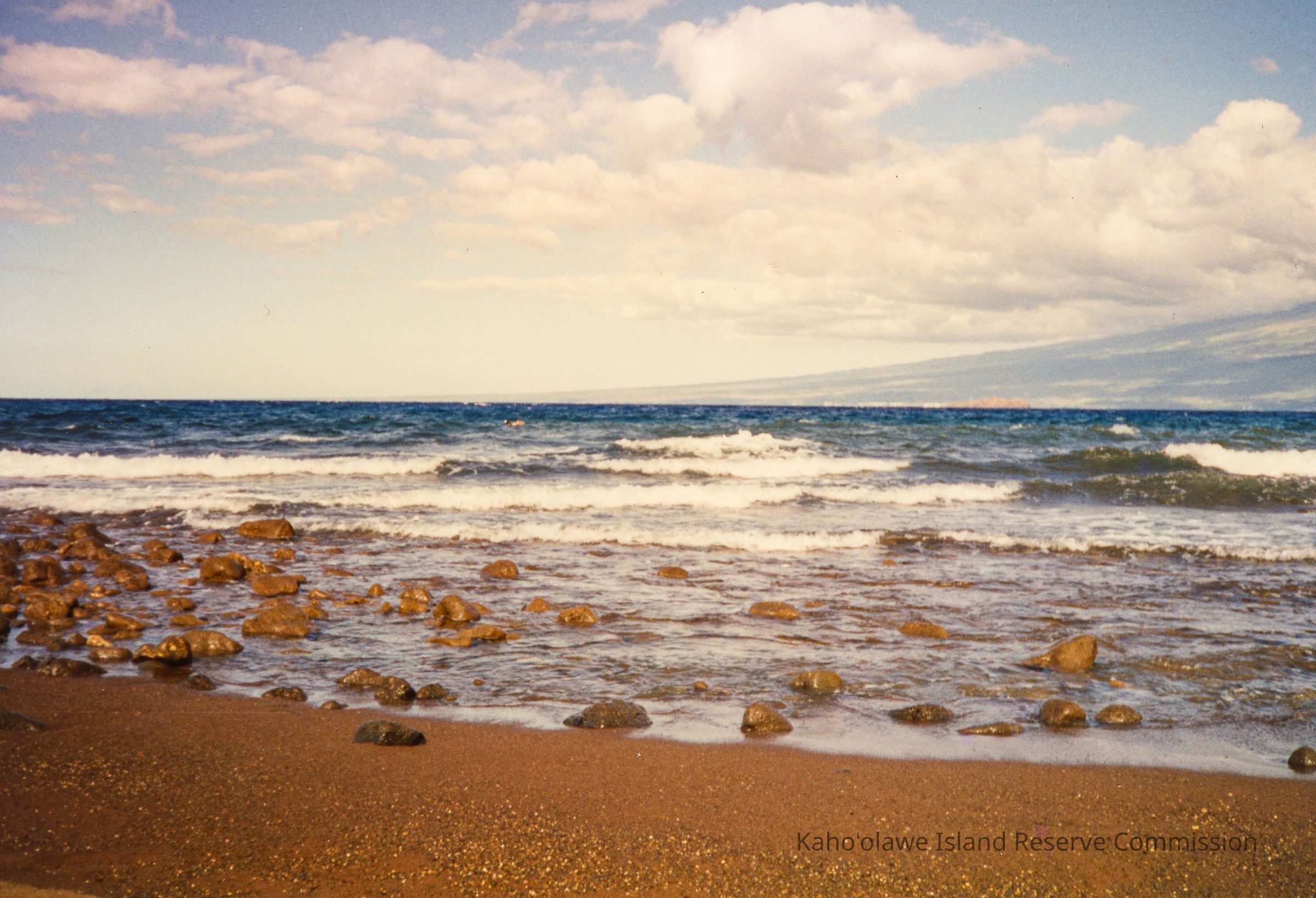 The image shows a peaceful beach scene with a sandy shore and scattered rocks, while gentle waves roll in under a sky filled with fluffy clouds.