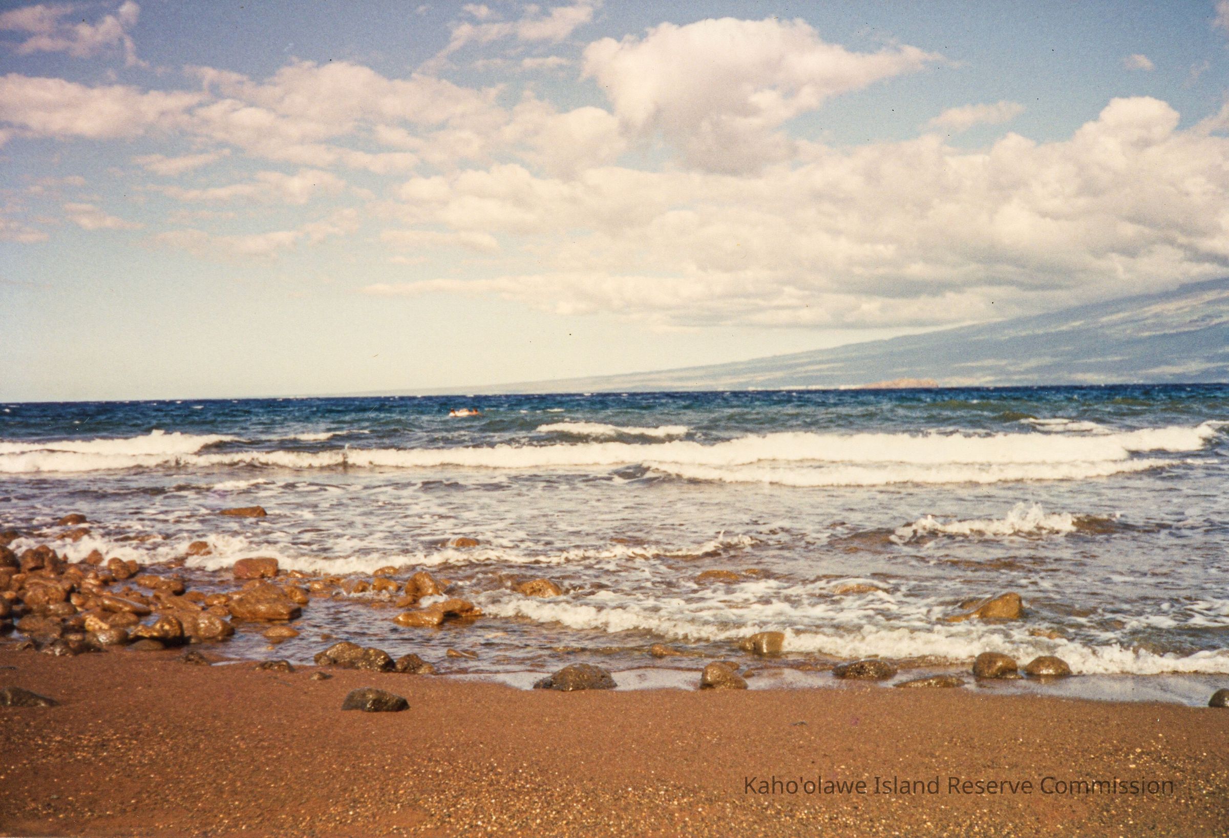 Color photo of waves in bay (probably Hakioawa Bay) with a person on a boogie board in the distance in choppy waves and a slightly rocky shoreline in the foreground and Maui in the background. There was a hand-written notation on a page several pages in front of the page which originally stored this photo. It reads: "November 14-17 1993; Advance Crew Before Makahiki." This photo was probably taken at Hakioawa Bay in Hakioawa 'Ili.