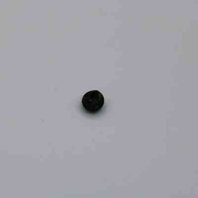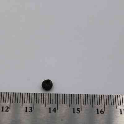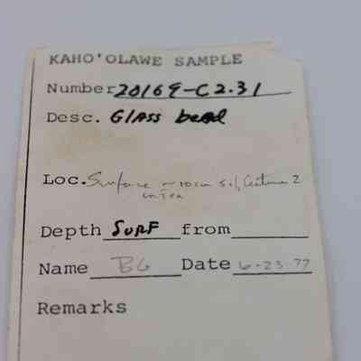 A small glass bead is placed beside an artifact slip labeled with identification details and a ruler for scale.