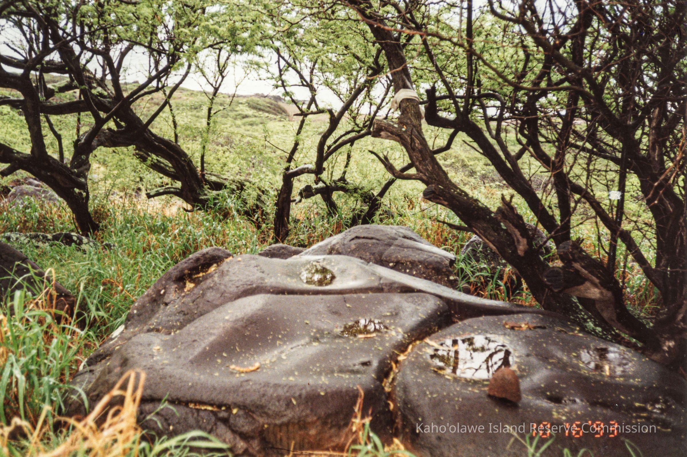 Color photograph of a group of smooth, undulating boulders with trees behind them.