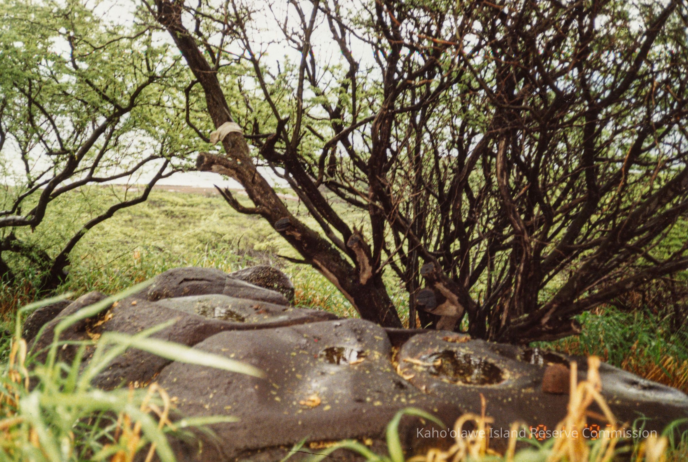 Color photo of several smooth faced boulders with irregular depressions with some kiawe trees behind them and grasses in the far background.