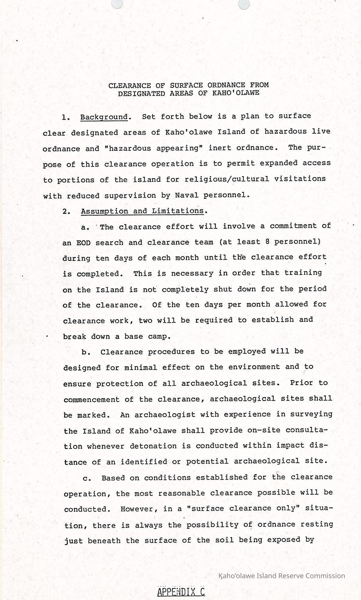Copy of Clearance of Surface Ordnance from Designated Areas of Kaho'olawe plan, labeled Appendix C to the draft consent decree. 4 xerographically copied 8.5" x 14" black and white pagesDate(s) of Creation