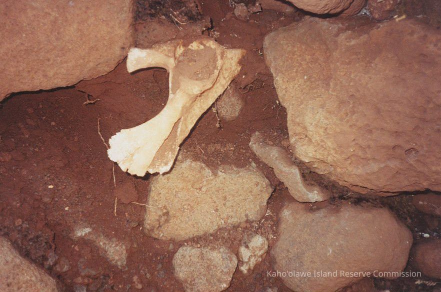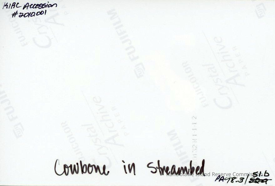 A close up photo of a cow bone in between rocks in a dry streambed, possibly in the Kuheia area.Collection