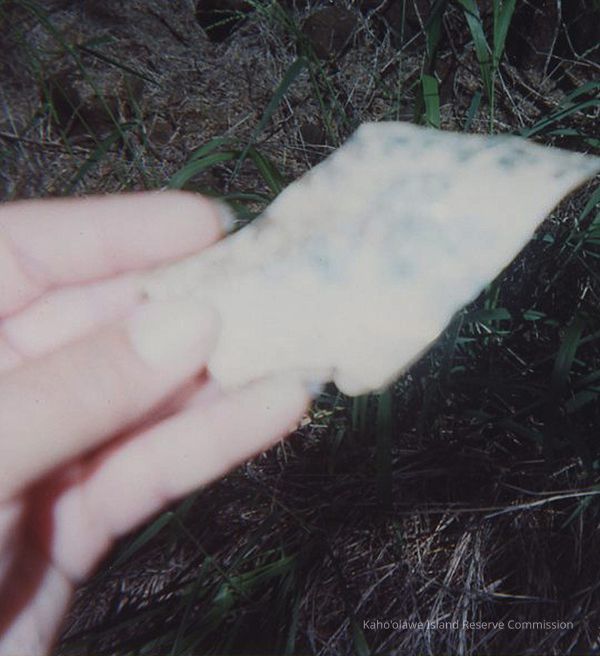 Color closeup of photo of a porcelain shard held in a hand. Photo taken in Kuheia.
