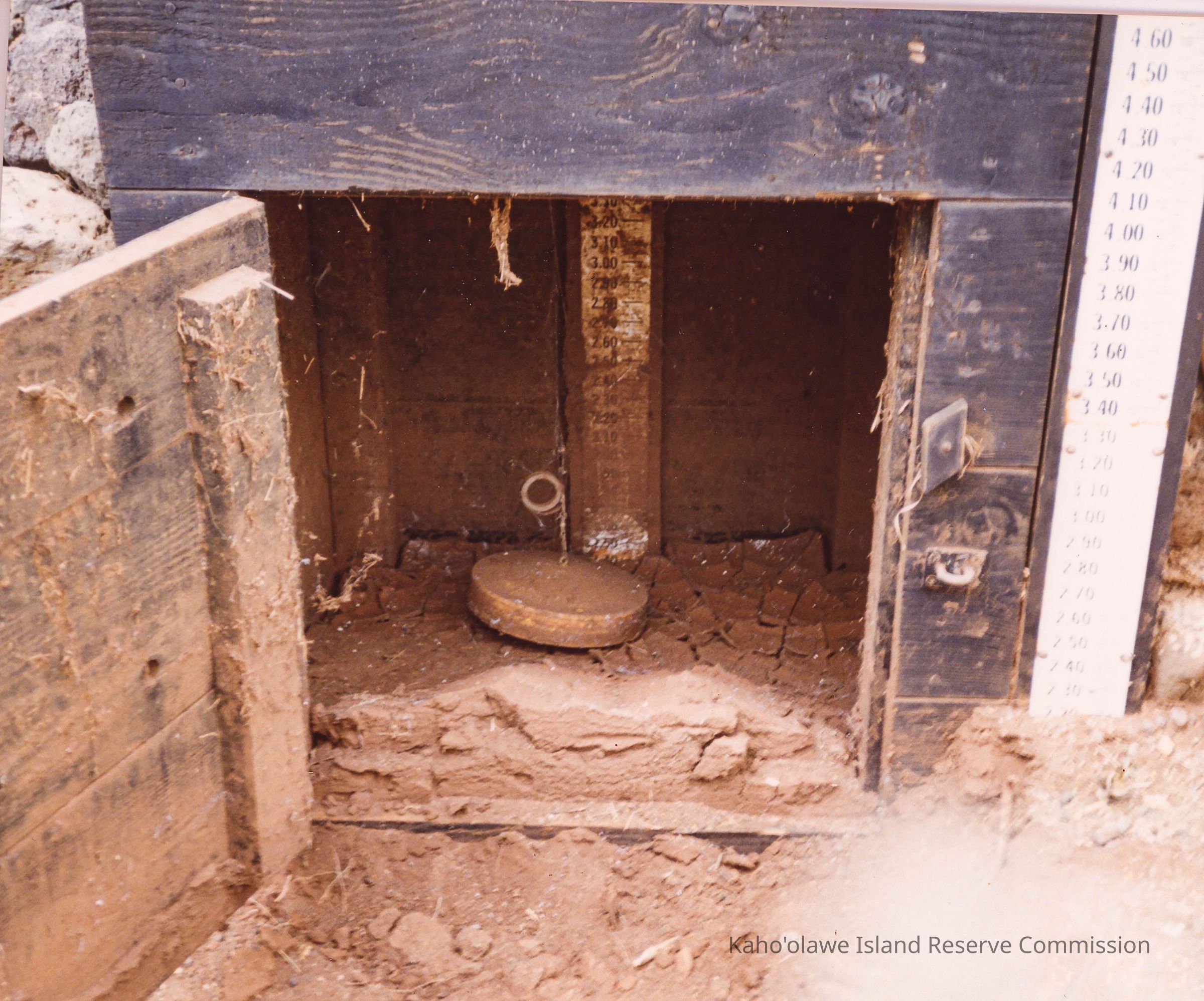Cropped, color close up of the interior of a water gage station, possibly at the Hakioawa Stream. There is a blur (possibly a thumb) in the lower right corner.Photograph Details