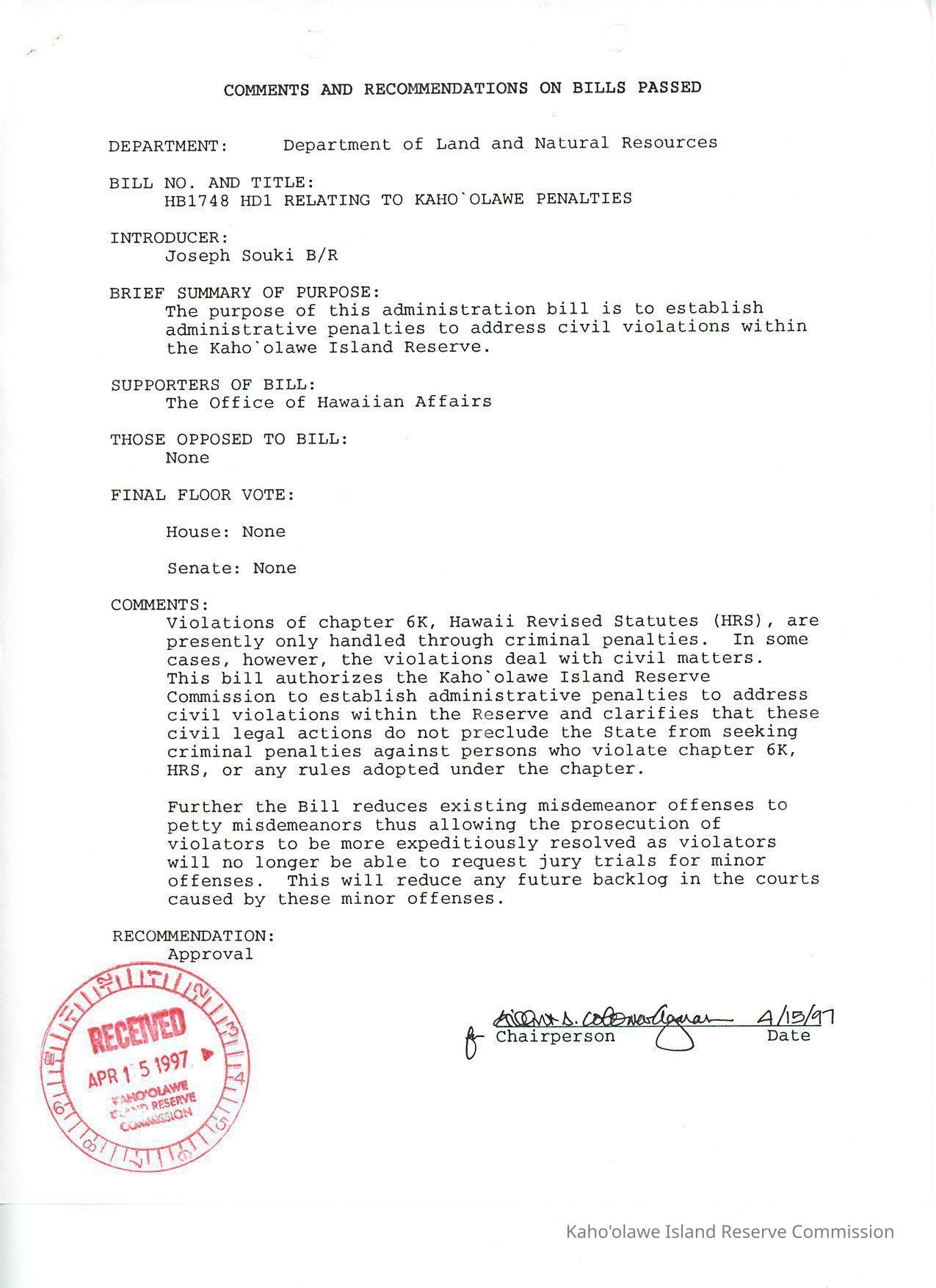 Comments and Recommendations on Bills Passed for HB1748 HD1 Relating to Kaho'olawe Penalties.Creator